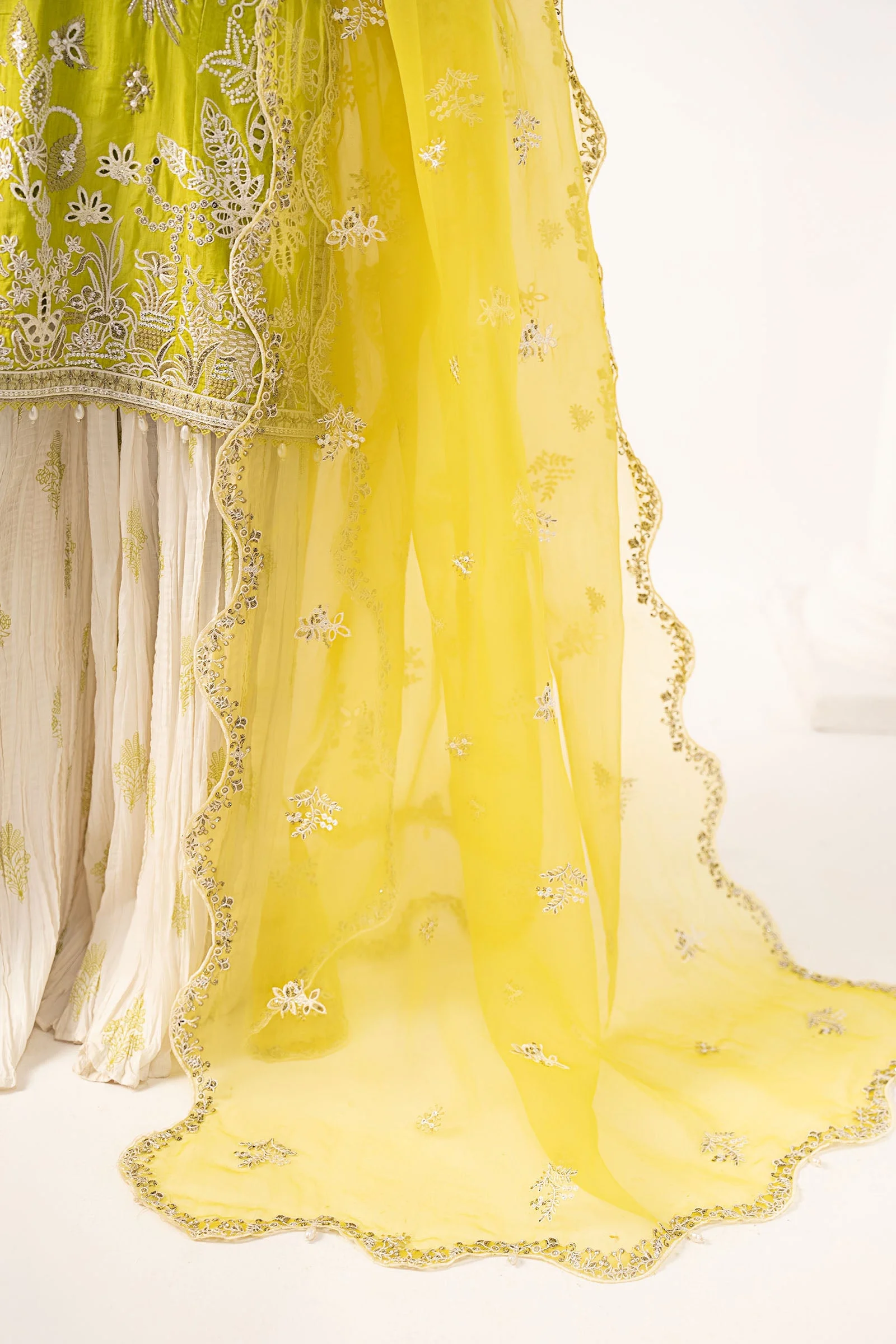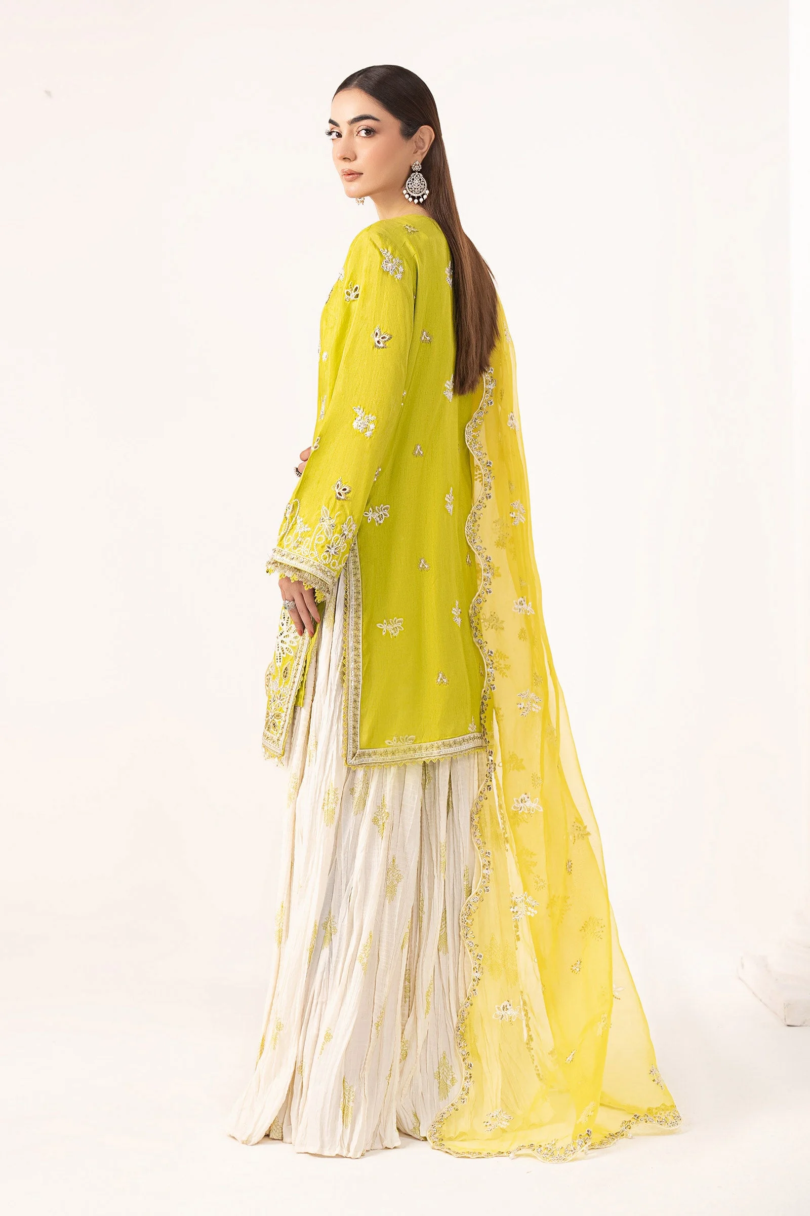 This stunning suit is a celebration of intricate artistry and refined style. Every inch of the embellished shirt has been crafted with careful attention to detail, featuring delicate threadwork and surface embellishments that catch the light beautifully. The crushed sharara adds graceful volume and movement, while the coordinating embroidered dupatta ties the entire look together with effortless sophistication. The acid green hue is bold yet wearable — a colour that truly commands attention at any event.