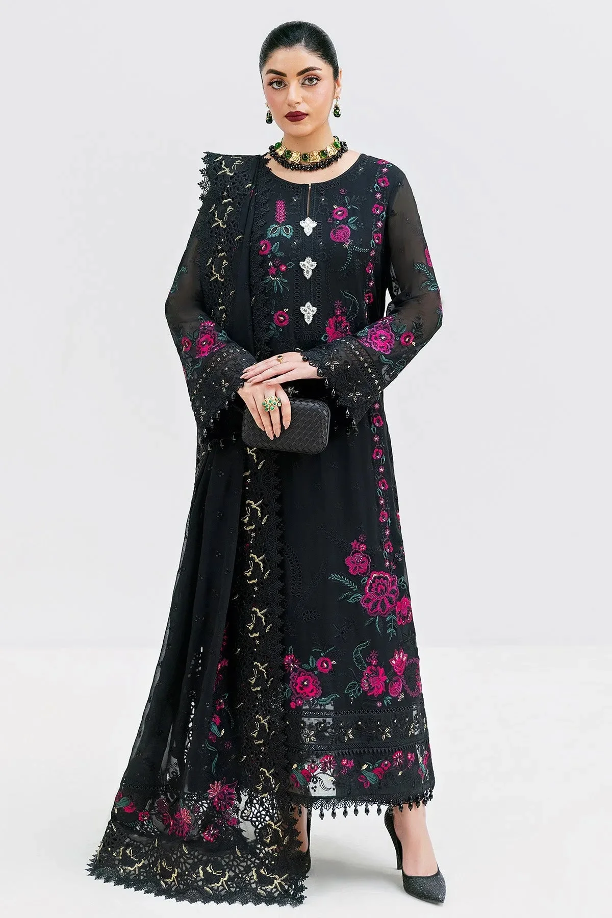 This luxury formal 3-piece suit is defined by its deep onyx black palette and intricate embroidery work that catches the light beautifully. The embroidered georgette shirt features delicate detailing across the neckline, hem, and sleeves, creating a silhouette that is both graceful and commanding. Every stitch reflects the rich tradition of Pakistani couture craftsmanship, making it a true showstopper at any occasion.