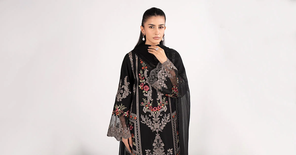 Elevate your festive wardrobe with this stunning black embroidered lawn party wear suit by Zilverah — a perfect blend of elegance and comfort for Eid, formal dinners, and special occasions. Crafted from premium lawn fabric with intricate embroidery, a flowing chiffon dupatta, and a tailored cambric trouser, this 3-piece ensemble is designed to make you stand out. Order now and enjoy free delivery across Norway — straight from Pakistan’s finest fashion to your doorstep.