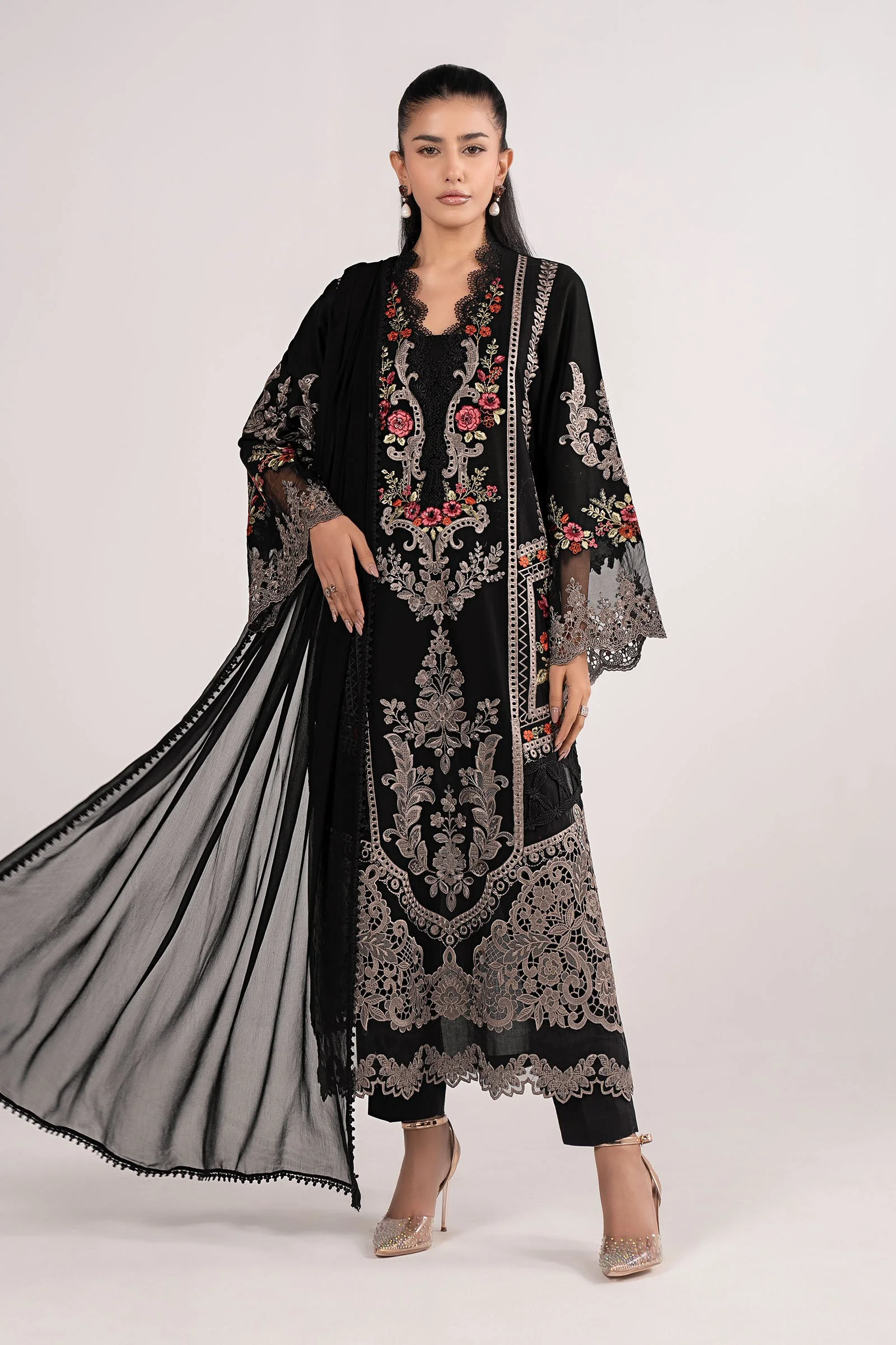 This black embroidered suit is a wardrobe essential for South Asian fashion lovers in Scandinavia. Pair it with gold or silver jhumkas and matching heels for an Eid lunch look. For a formal dinner or a Pakistani wedding event, add a statement clutch and bold eye makeup to let the embroidery do the talking. The neutral black base means you can style it differently every time.