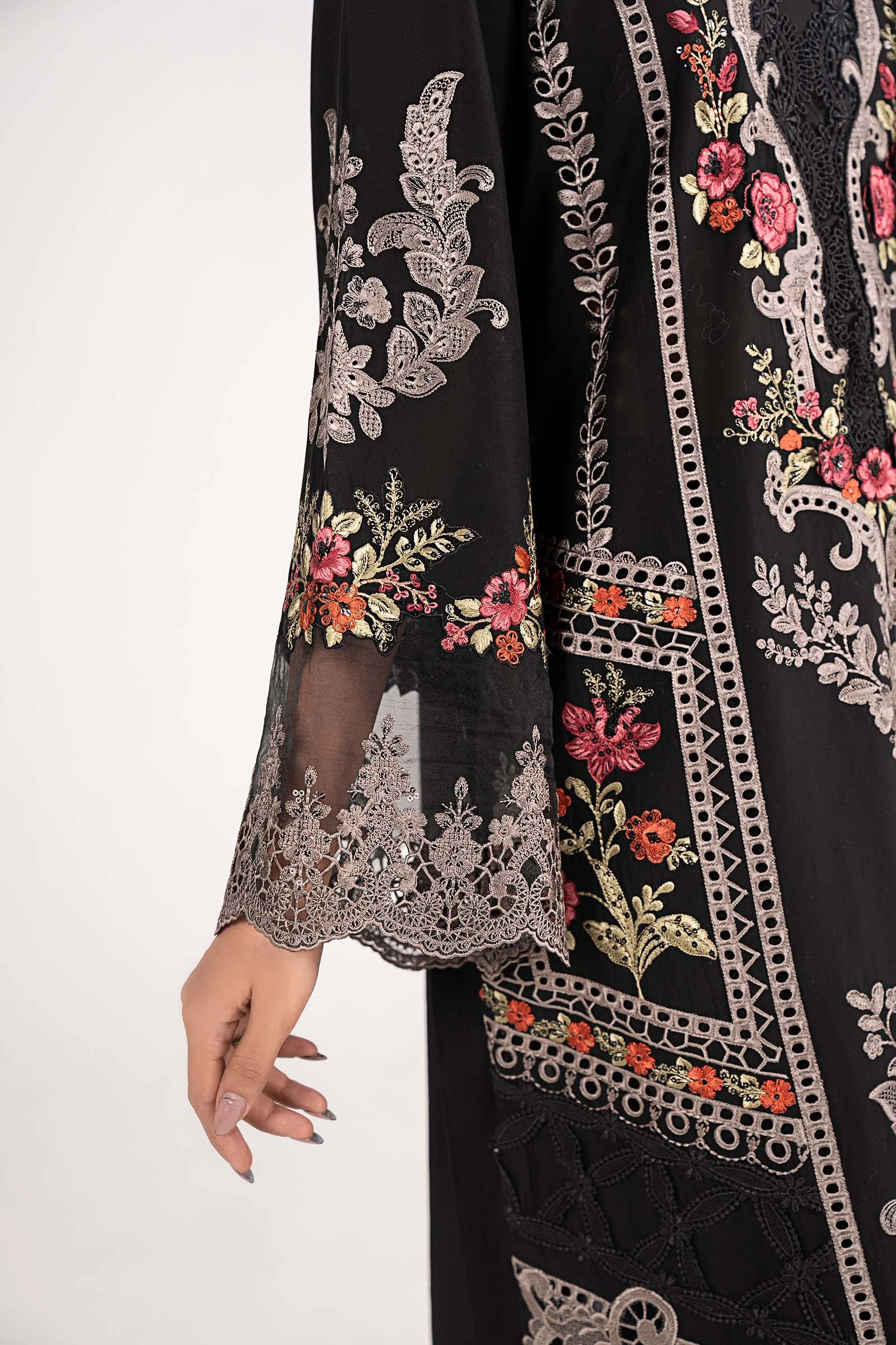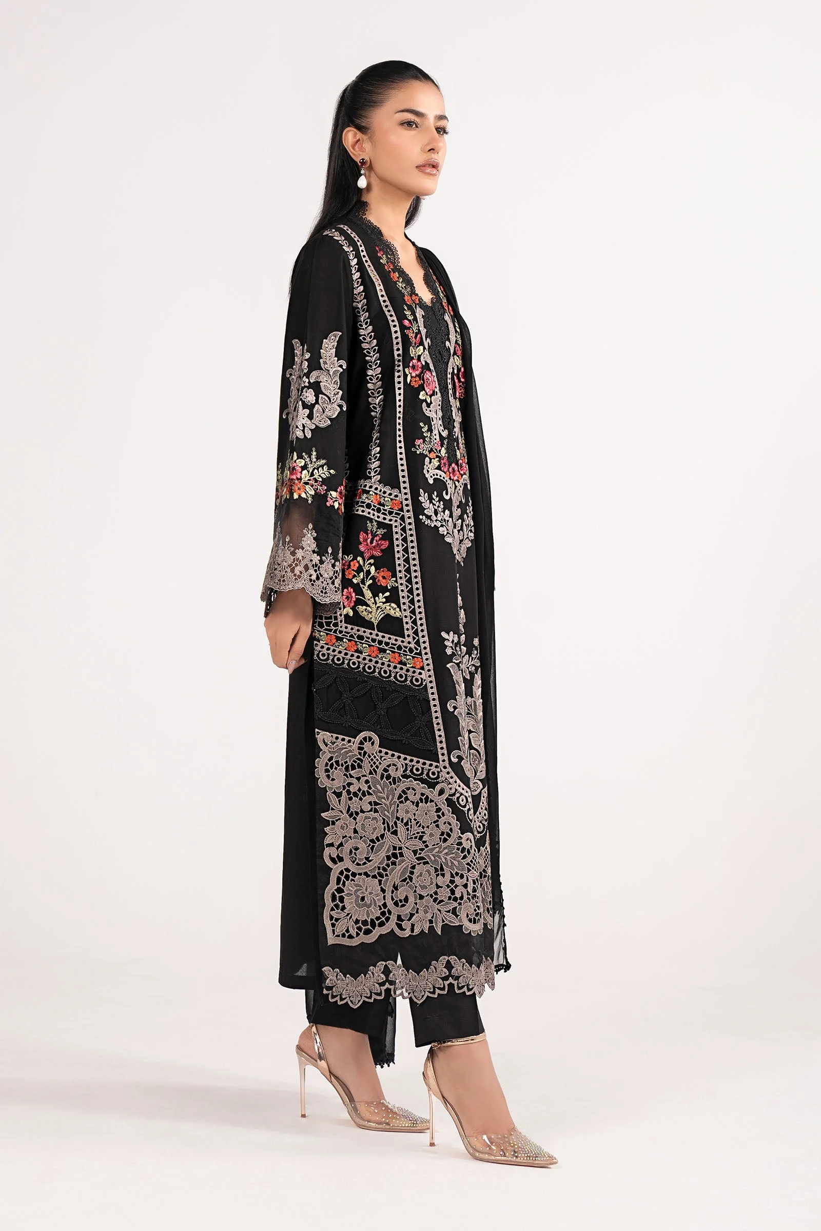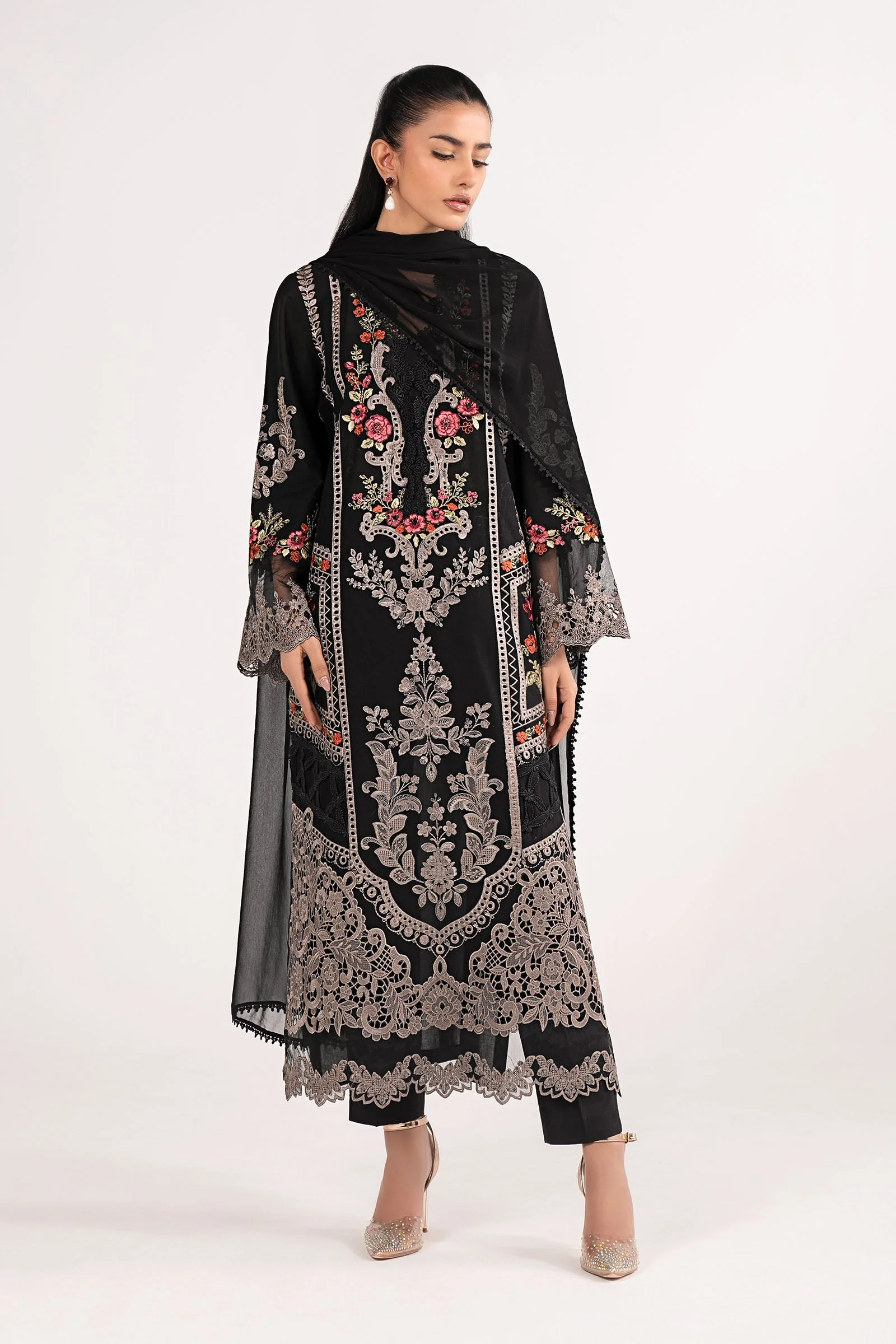 This straight-cut embroidered lawn shirt is a masterpiece of understated glamour. The all-black palette makes it effortlessly versatile, while the detailed embroidery across the neckline and hemline adds a rich, festive character. Clean lines and a structured silhouette give this suit a refined, sophisticated aesthetic suited for today’s modern South Asian woman.