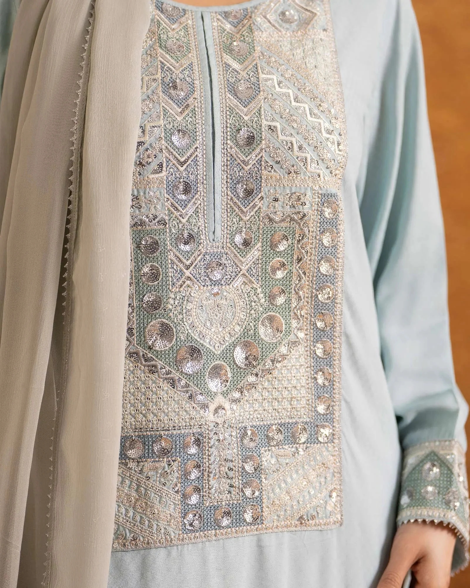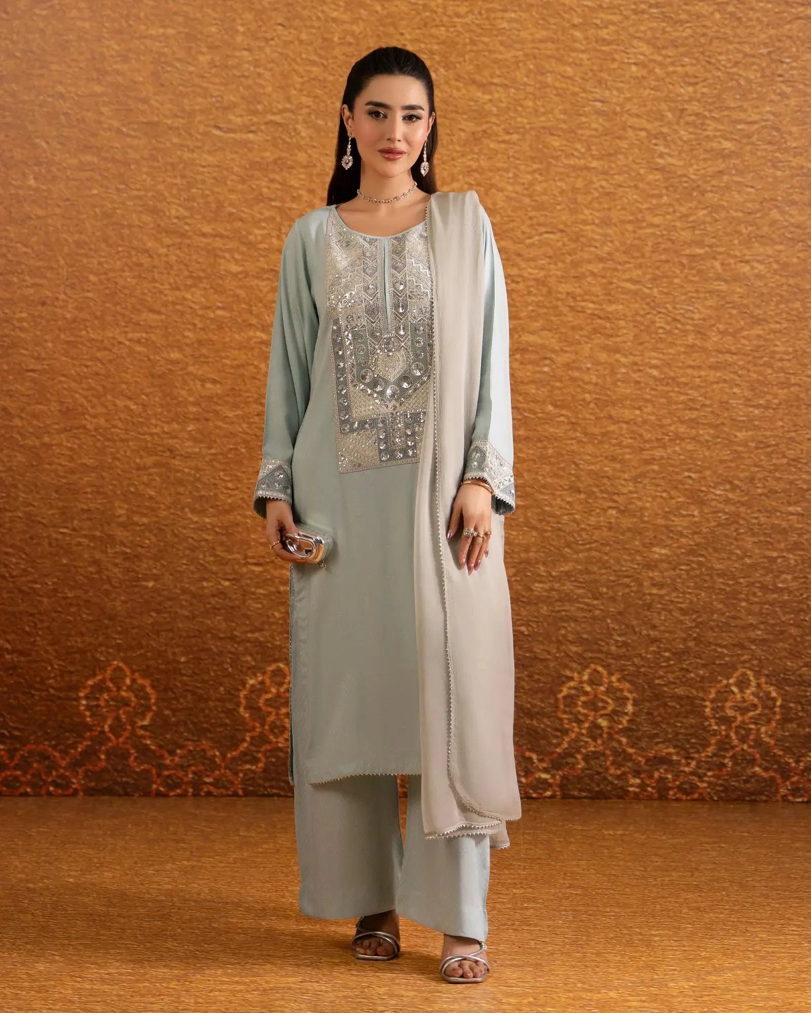 This 3-piece set is crafted from imported Dabbi Silk — a premium fabric known for its lustrous sheen, smooth drape, and comfortable wear. Dabbi Silk is a popular choice in Pakistani formal fashion for its ability to hold embroidery elegantly while remaining lightweight enough for extended wear. The crinkle chiffon dupatta adds a soft, flowing dimension to the overall look.