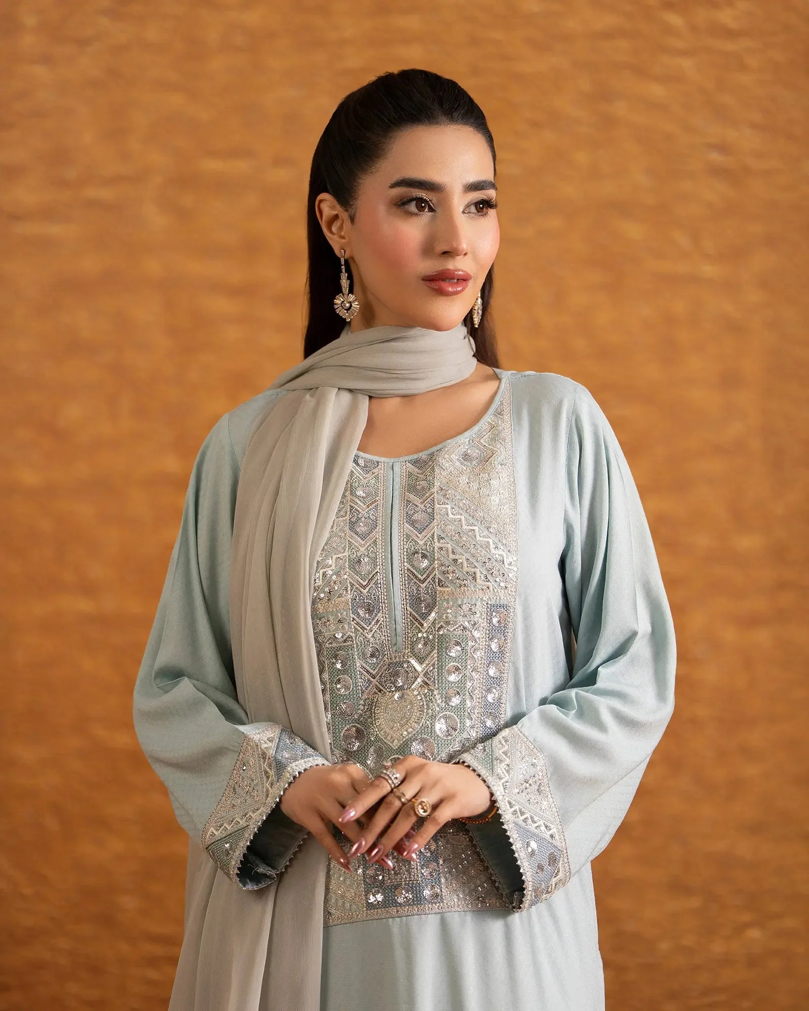 Elevate your wardrobe with this stunning Zilverah Dabbi Silk 3-Piece Formal Wear ensemble, featuring a tilla embroidered shirt, matching silk trousers, and a crinkle chiffon dupatta in a vibrant Ferozi shade. Crafted from premium imported Dabbi Silk, this set is designed for women who want to make a lasting impression at weddings, Eid celebrations, and formal events. Order now and enjoy fast, reliable delivery across Norway — bringing authentic Pakistani fashion right to your door.