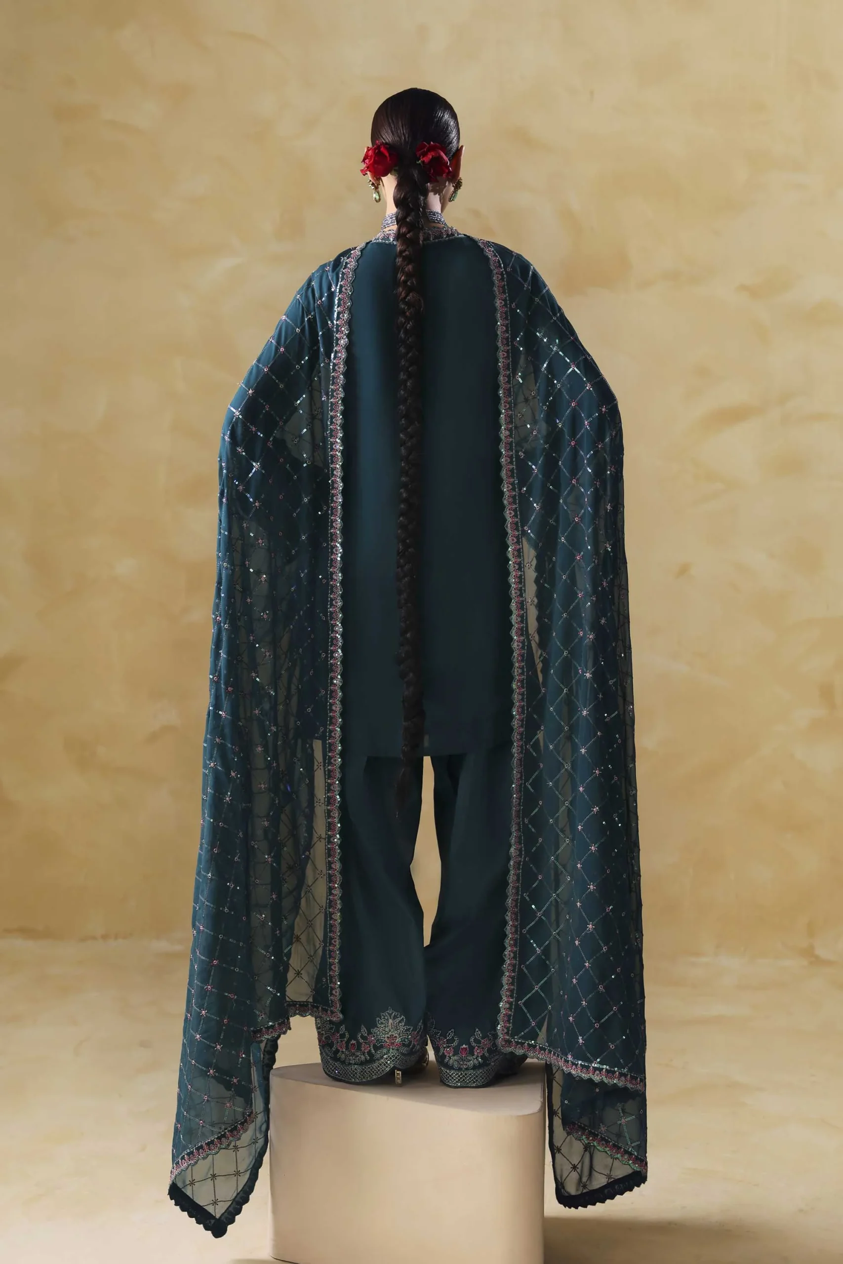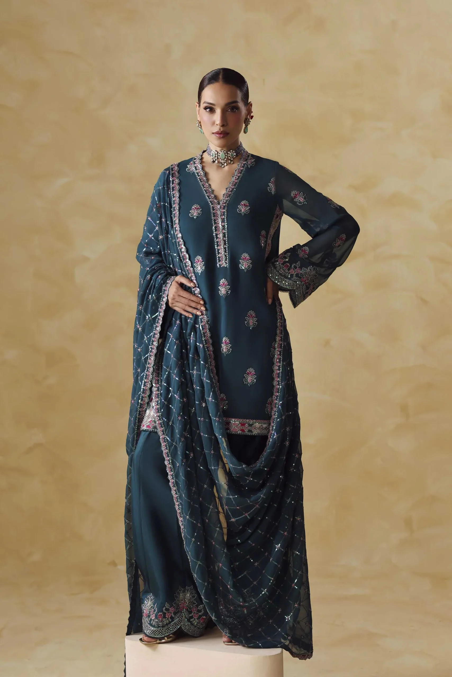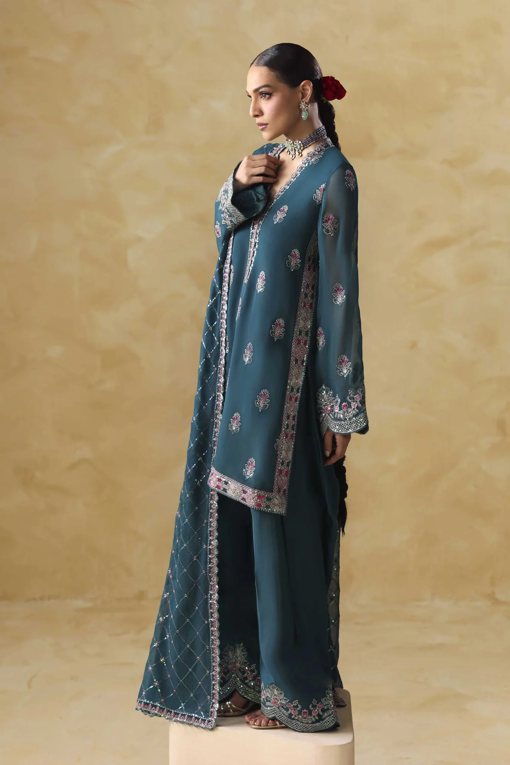 This complete 3-piece Pakistani formal suit is ready to wear straight out of the box — no tailoring required.