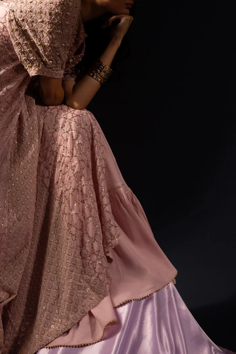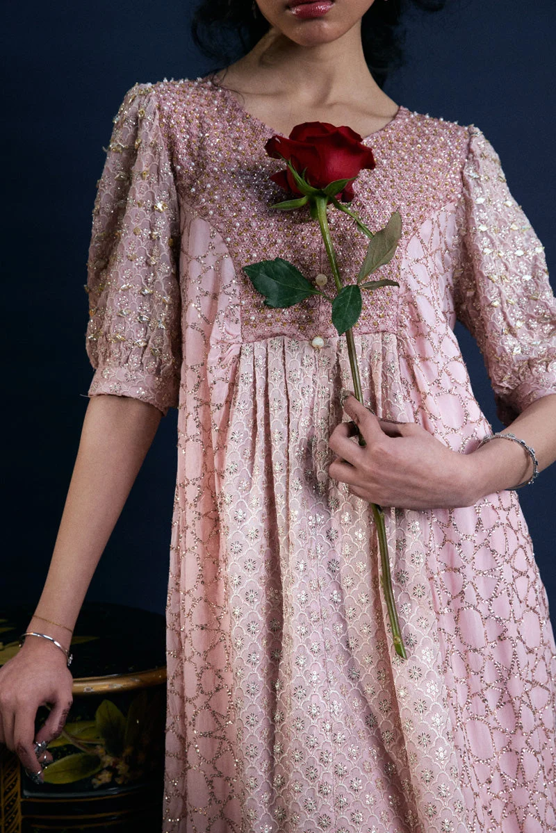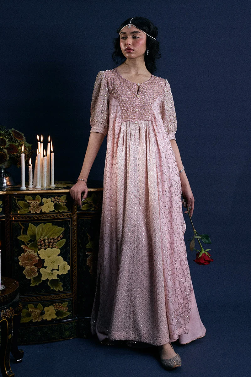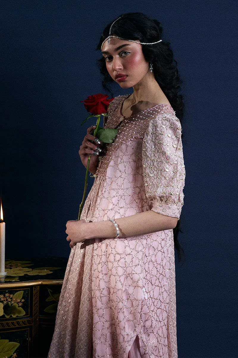 The centrepiece of this ensemble is a richly embellished Anarkali-style kameez featuring all-over threadwork and shimmering sequin detailing. The bodice is lavishly adorned with pearl and sequin accents that catch the light beautifully. Soft gathers fall gracefully from an empire waist at both front and back, creating a fluid, flared silhouette that moves with effortless grace. The feminine puff sleeves are finished with hand-applied gota work on cuffed hems — a signature detail that speaks to the artistry behind every stitch.