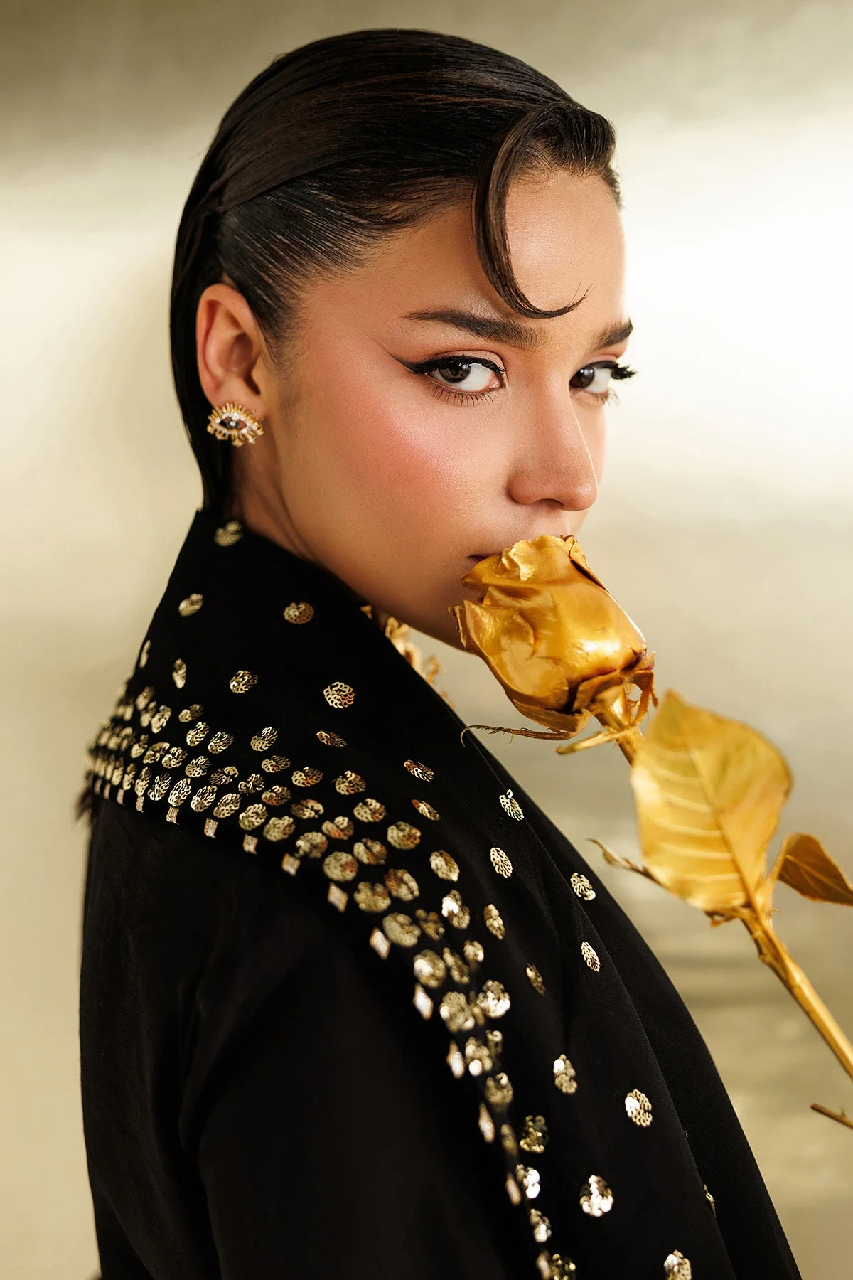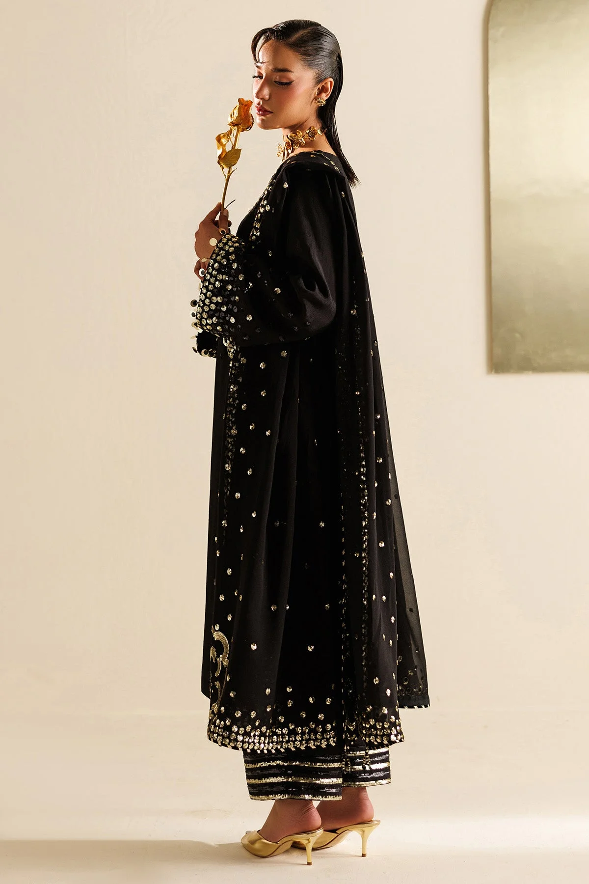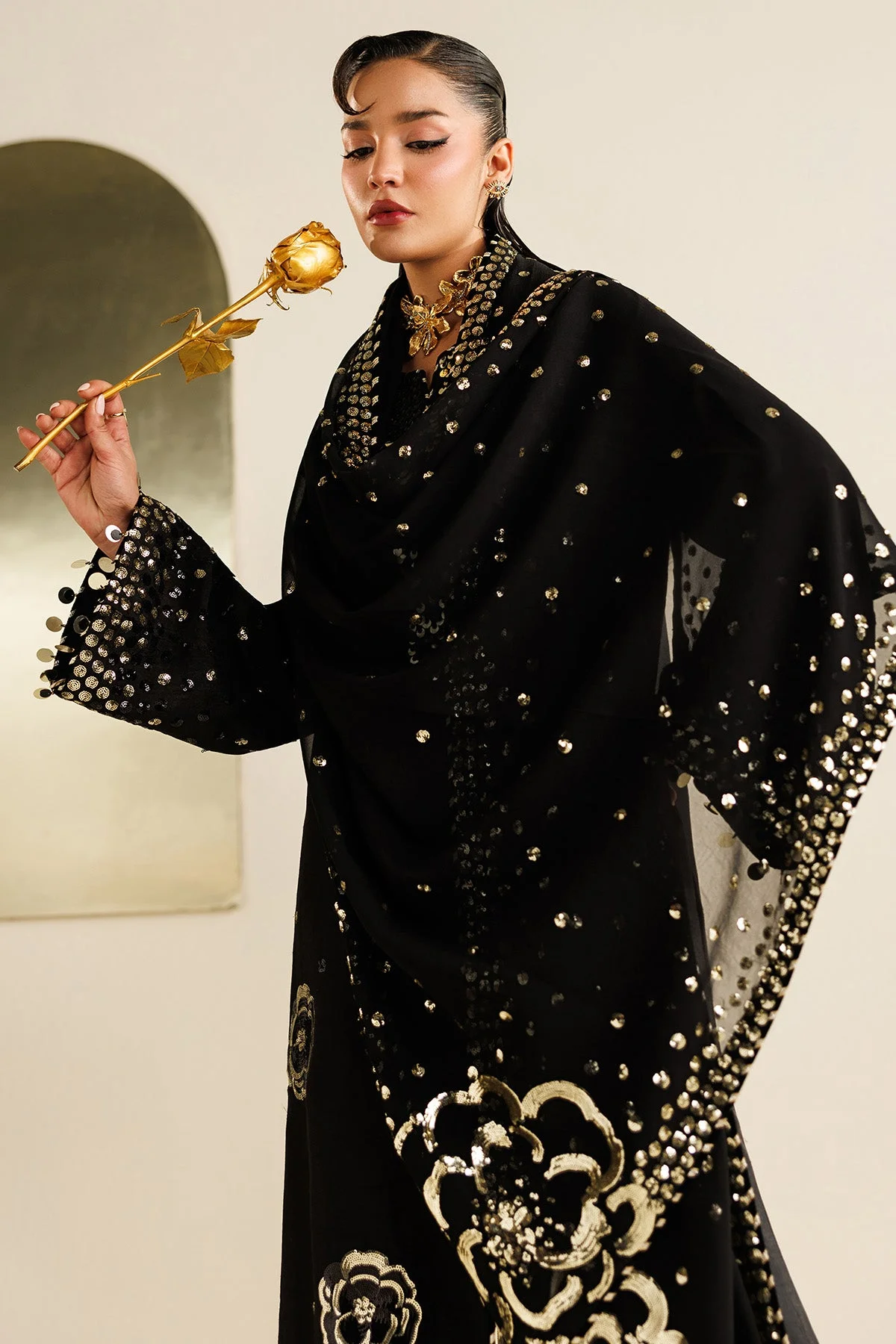 Pair this ensemble with gold or antique jewellery to complement the rich embroidery tones. High heels or embellished khussa footwear work beautifully with this silhouette. Drape the dupatta over one shoulder for a classic look, or style it as a veil for a more formal bridal-adjacent aesthetic. Whether you prefer a sleek updo or soft curls, this Pakistani formal wear dress adapts effortlessly to your personal style.