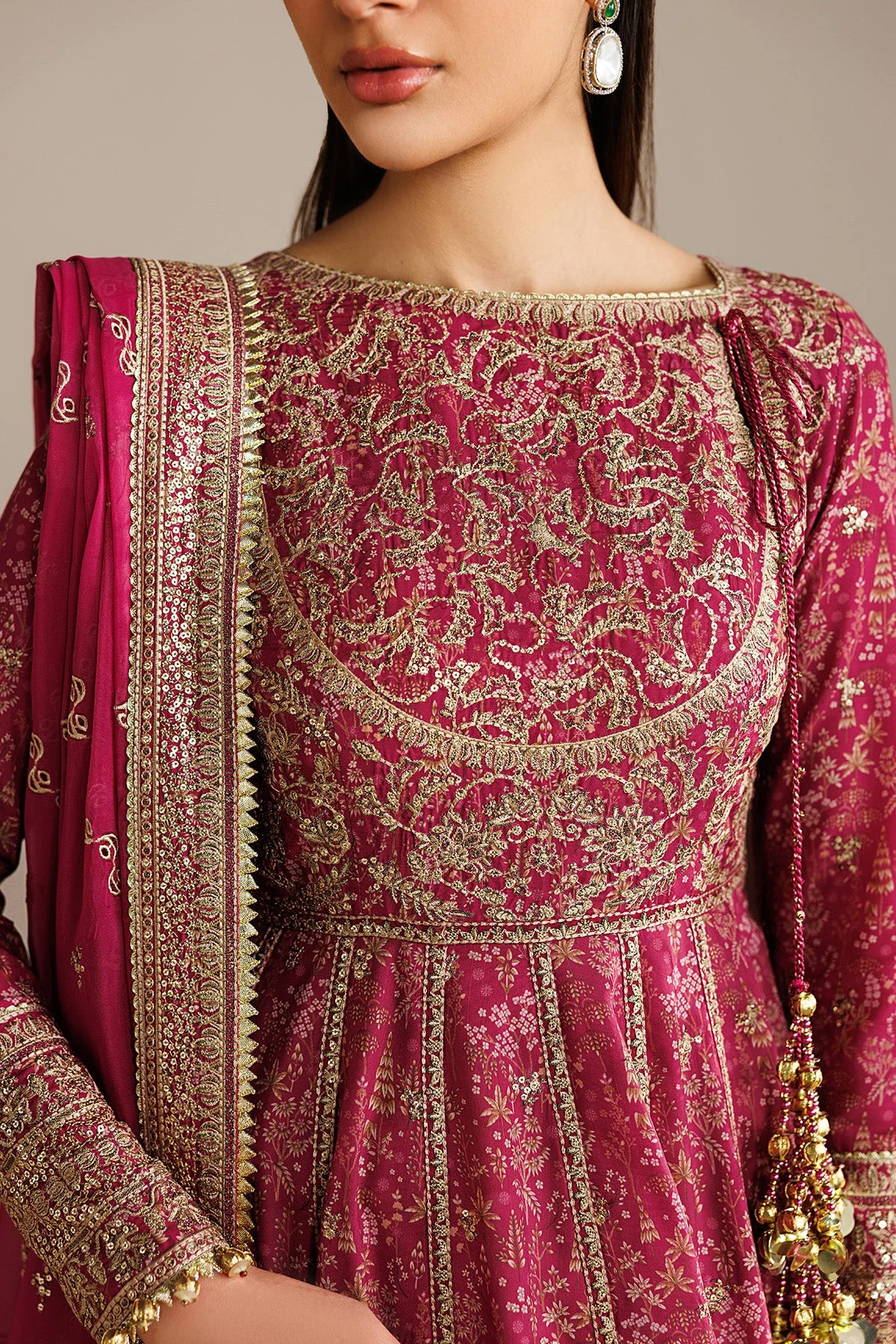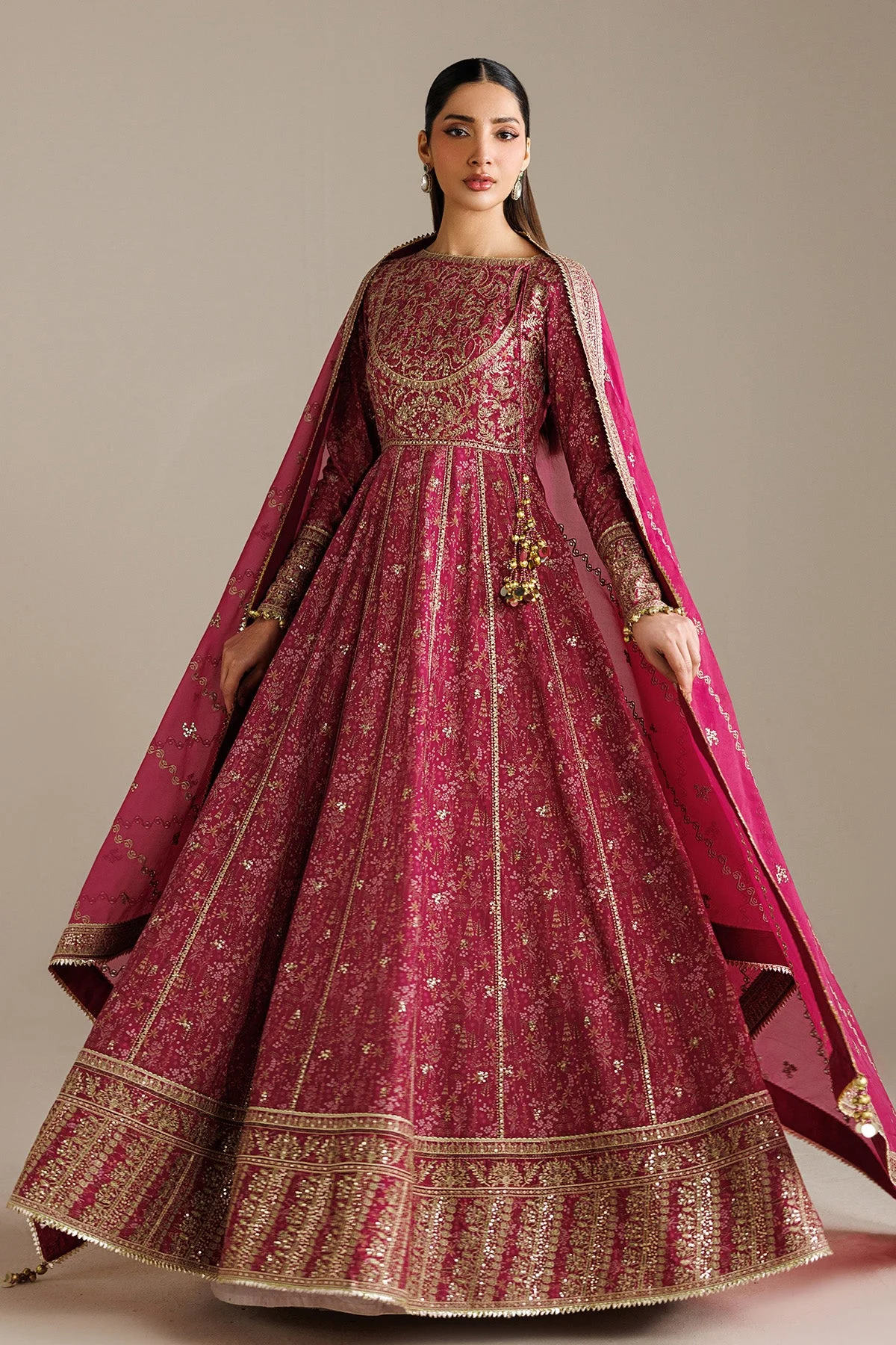 This ensemble features intricate embroidery across the shirt, bringing together multi-tonal embroidered accents that catch the light beautifully. The delicate craftsmanship reflects the finest traditions of Pakistani formal fashion, making it an ideal choice for any grand occasion. The flowing organza dupatta adds a soft, ethereal finish that completes the look with effortless elegance.