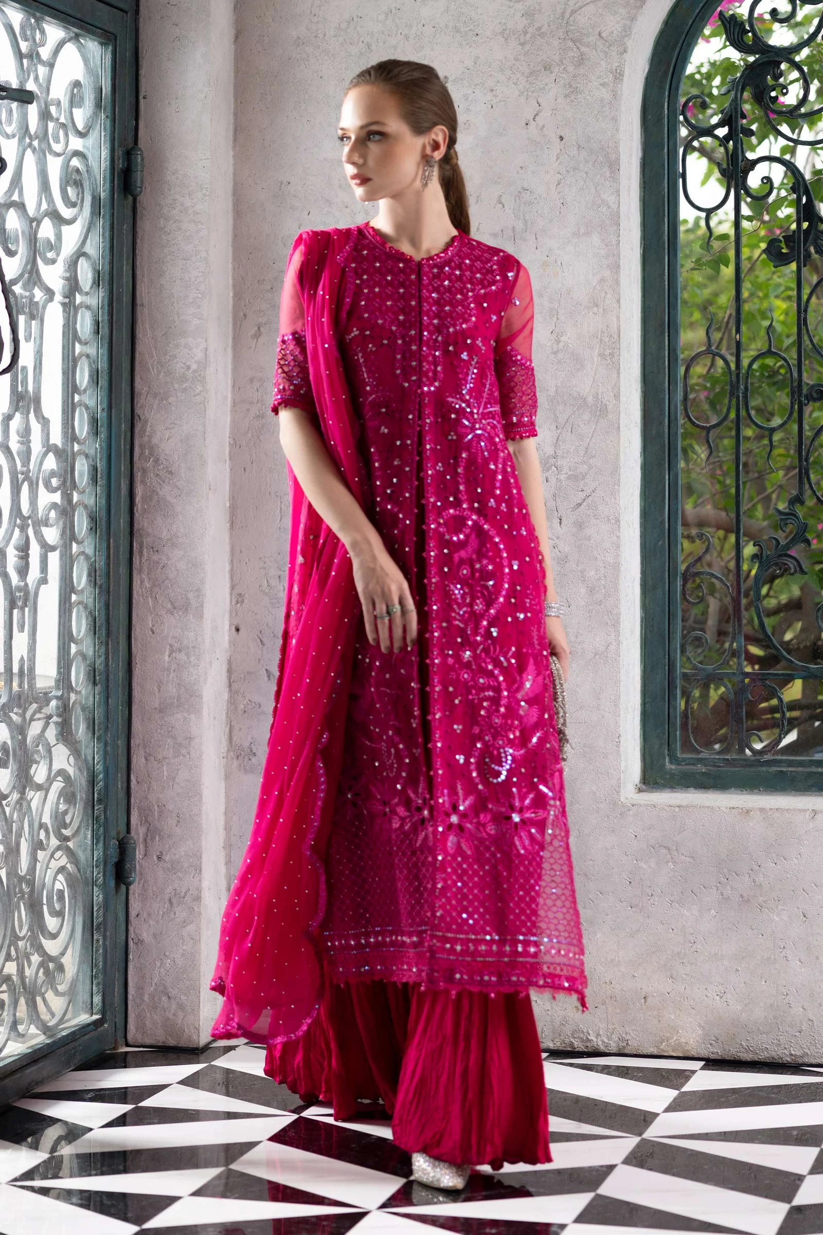 Discover the pinnacle of South Asian elegance with this Zilverah 3-Piece Embroidered Organza Jacket Suit in radiant fuchsia pink — a statement piece in luxury formal wear that commands attention at every grand occasion. Designed for the discerning Pakistani and South Asian woman living in Norway, this ensemble delivers the artistry and opulence of premium Pakistani fashion directly to your doorstep in Oslo, Bergen, Stavanger, or anywhere across Scandinavia.