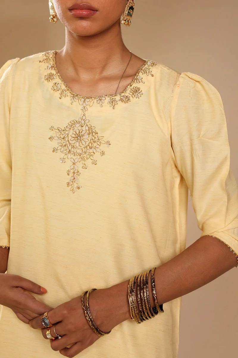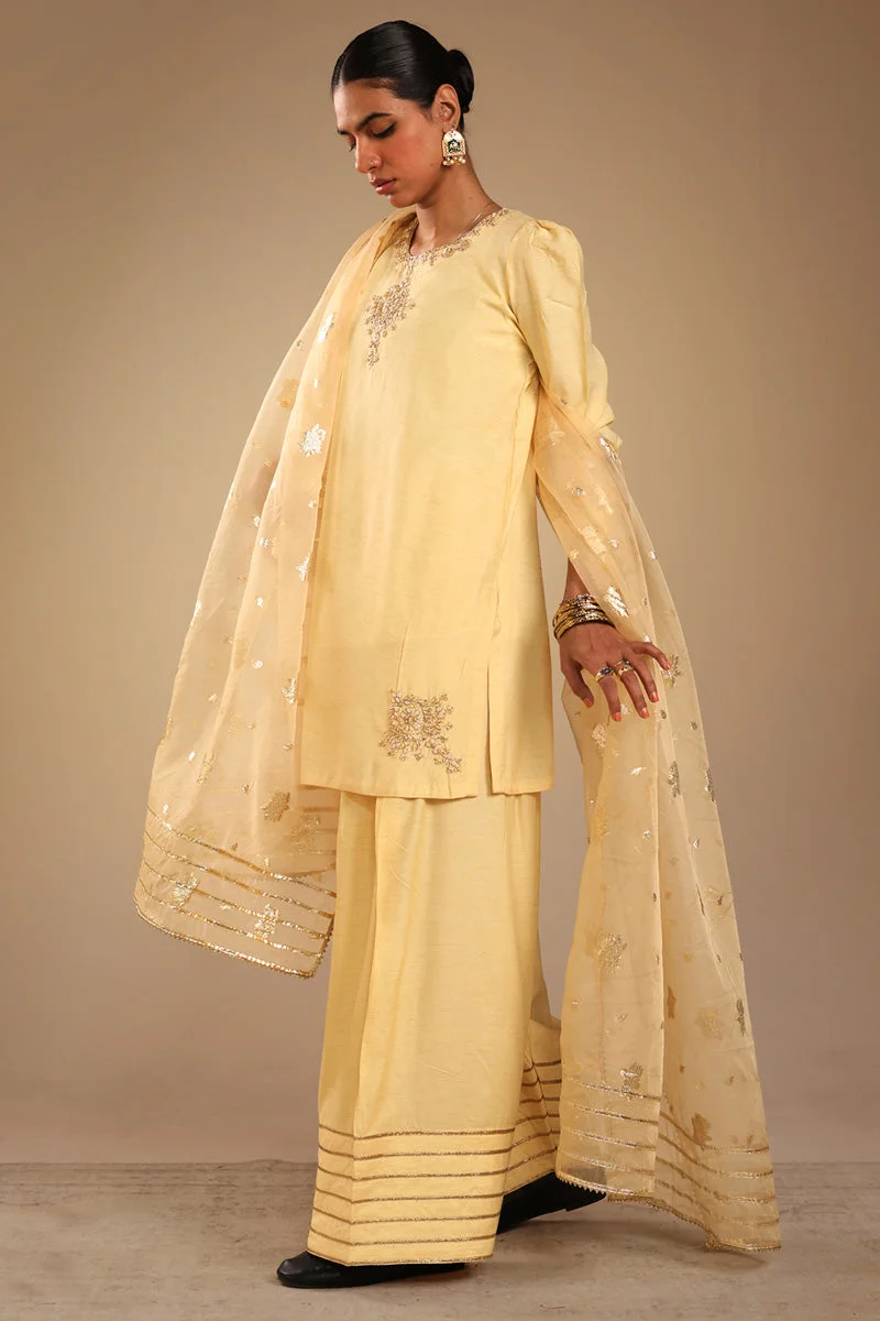 Style this vibrant yellow ensemble with gold jhumkas and a statement clutch for a head-turning look. Pair with strappy heels to elongate the silhouette of the farshi shalwar. The luminous Raw Silk Lurex fabric photographs beautifully, making this an ideal choice for event portraits and memorable family moments.