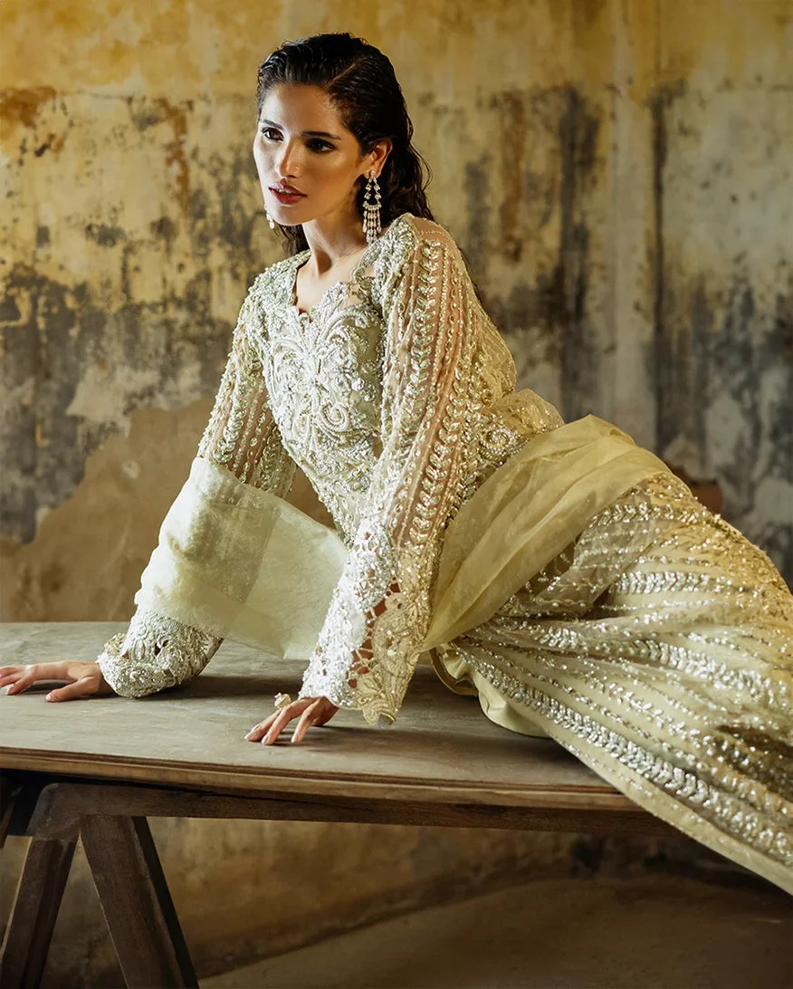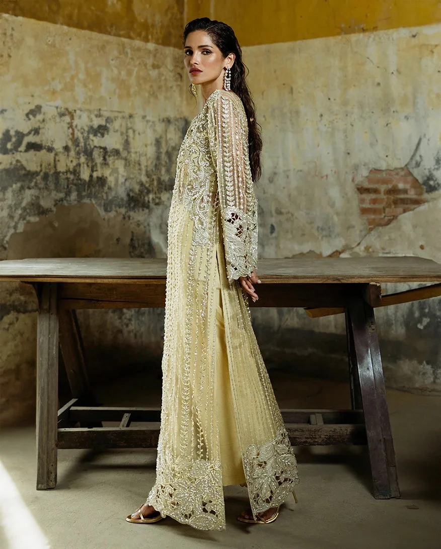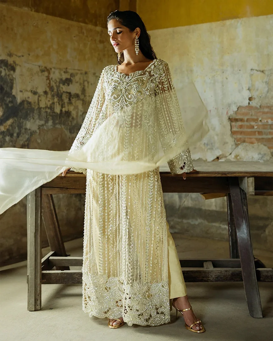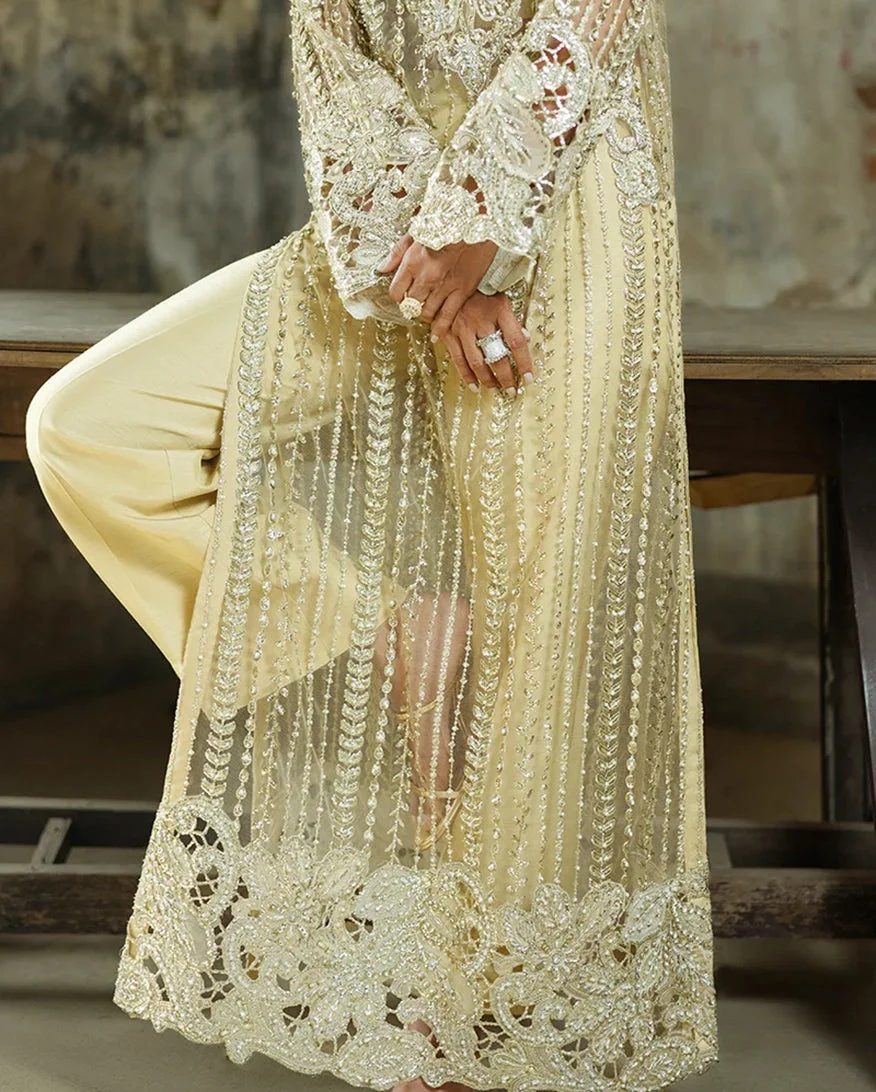 The Marguerite is a celebration of opulence and craftsmanship. The golden embroidered net shirt features intricate floral and geometric embroidery, giving it a luminous, festive quality that catches the light beautifully. The rich golden tone is universally flattering and perfectly suited to the grandeur of South Asian celebrations. Every stitch reflects the heritage and artistry of Pakistani luxury fashion.