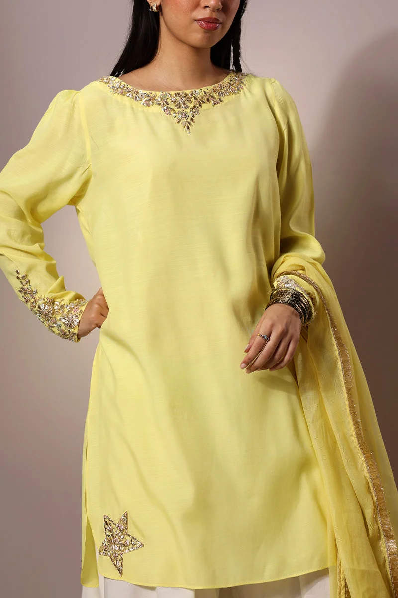 This beautifully composed set is a masterclass in traditional embellishment and contemporary silhouette. The classic-fit embroidered shirt features a graceful round neckline, statement puff sleeves with tailored hems, and a softly rounded hemline that flows effortlessly. The flared sharara is finished with signature gota edges, lending a festive luminosity to every step. Completing the look, the dupatta is adorned with delicate kiran lace along the edges for a refined finishing touch.