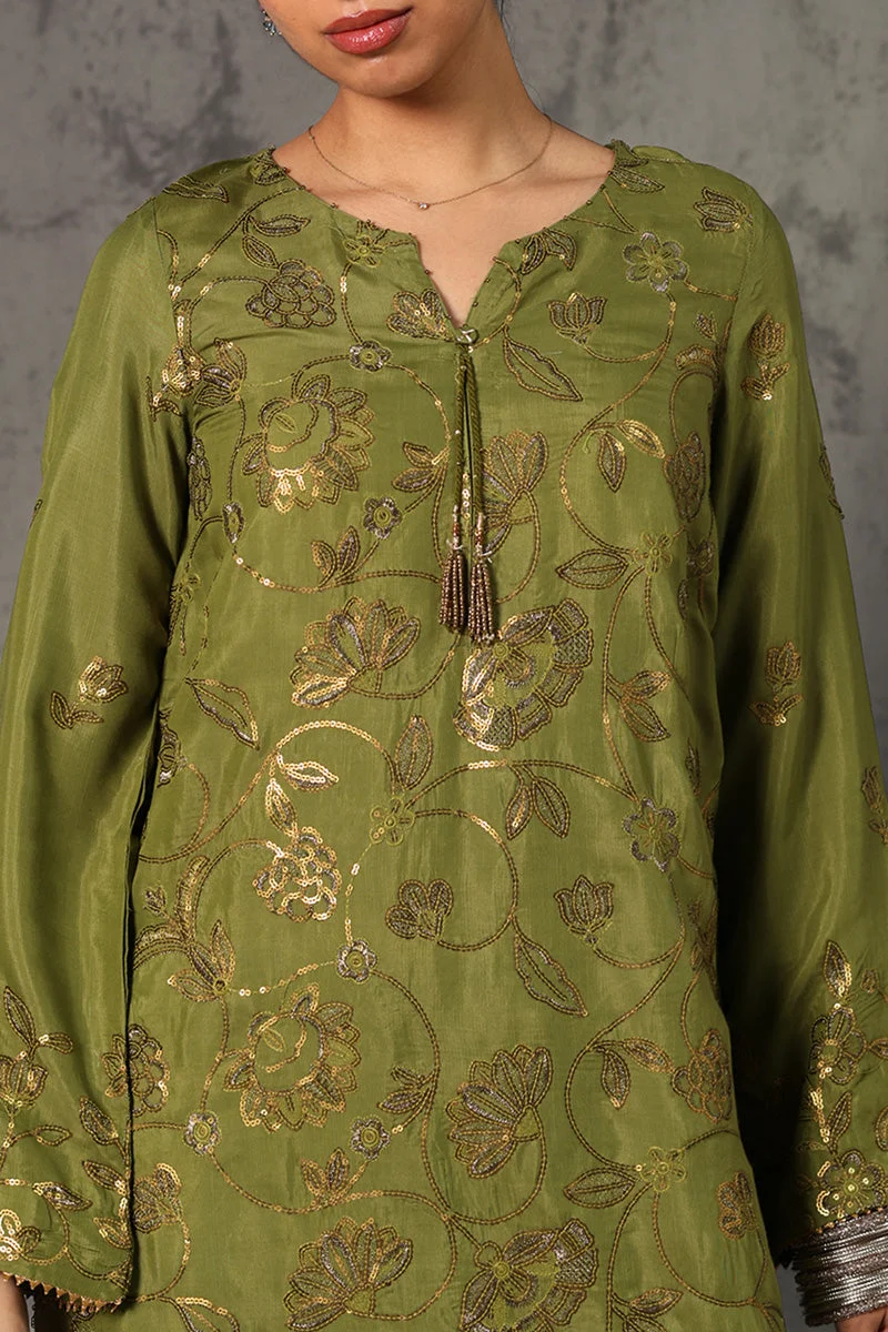 Elevate your special occasions with this stunning Zilverah grape green raw silk 3-piece formal wear ensemble, featuring sequin embellishments, beaded tassel detailing, and intricate gota lace accents throughout. The classic-fit shirt is paired with a matching farshi shalwar and an embroidered cotton-net dupatta for a truly regal silhouette. Order now and enjoy free delivery across Norway — bringing authentic Pakistani formal fashion straight to your door.