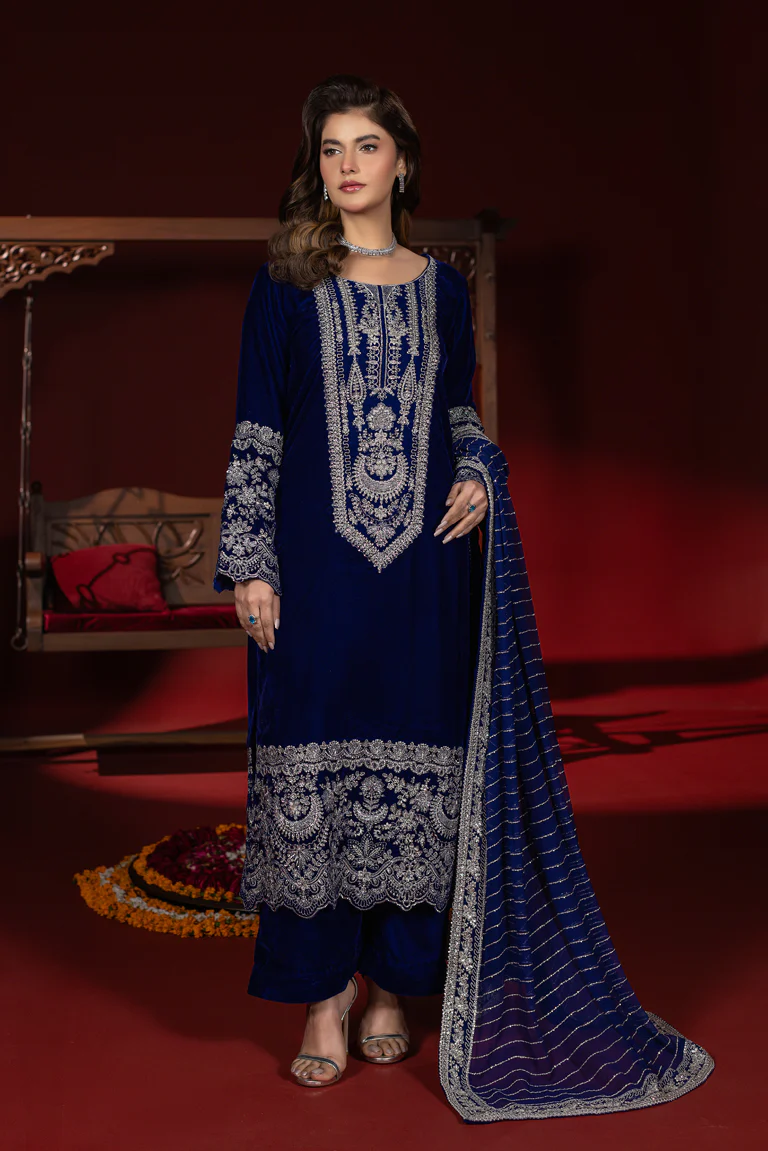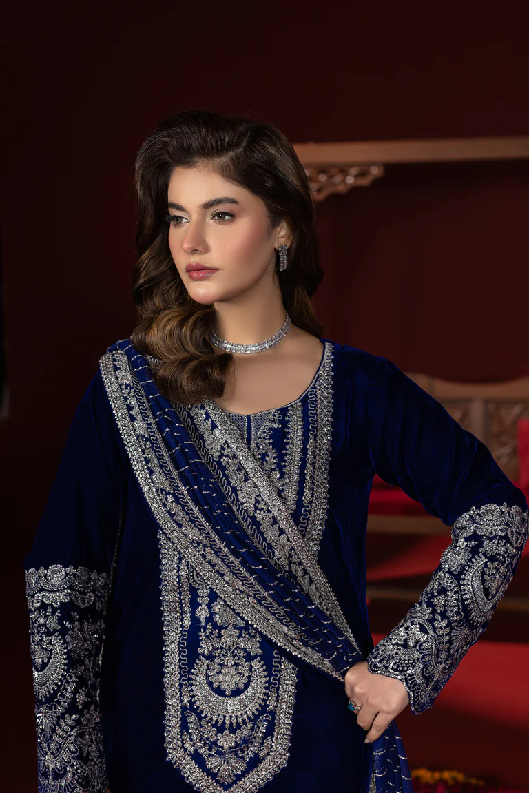 Enter with grace in this deeply detailed royal blue outfit. The long velvet shirt is adorned with an amazing silver threading work in the neckline, front, and sleeves with embroidery. It has straight trousers, which keep the silhouette straight and balanced. The outfit is completed with a soft elegance of an ethereal embroidered chiffon dupatta with delicate borders.