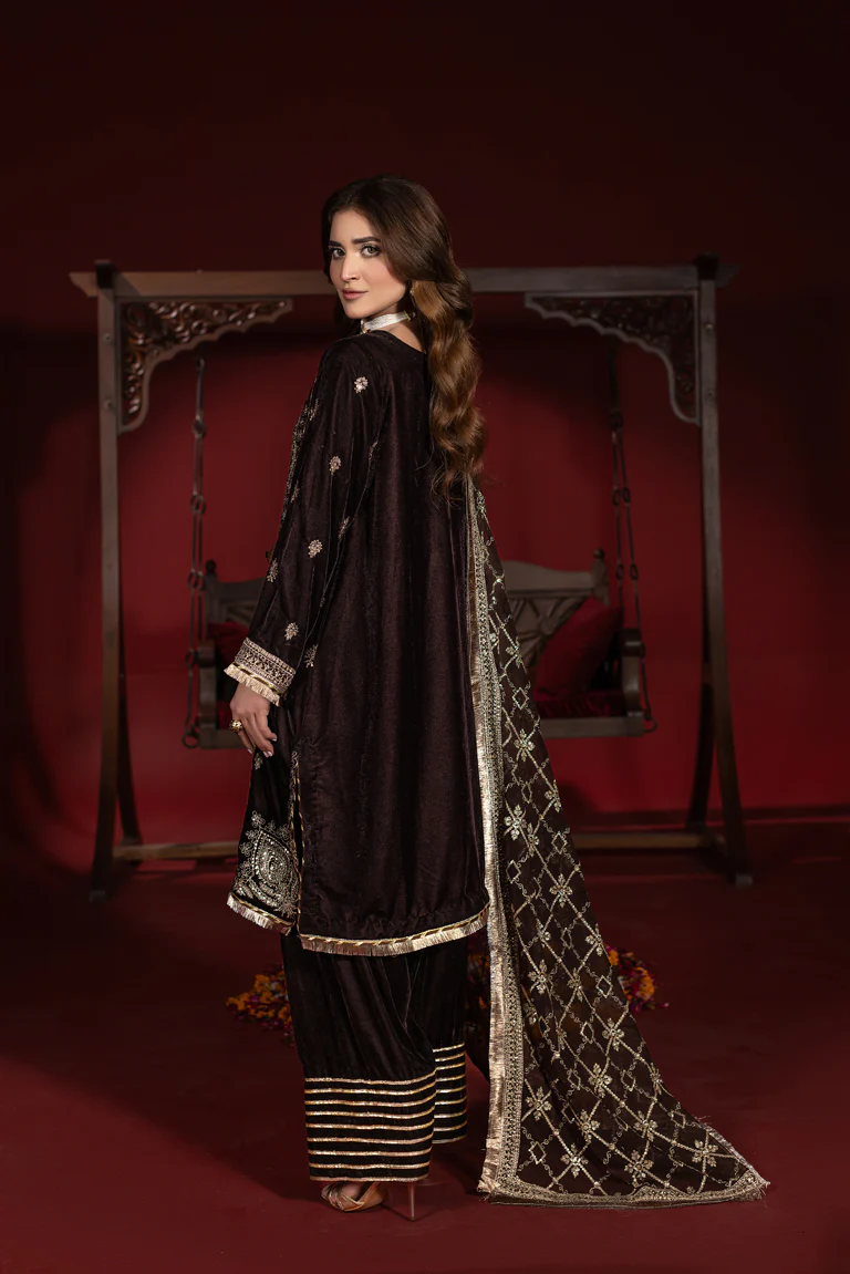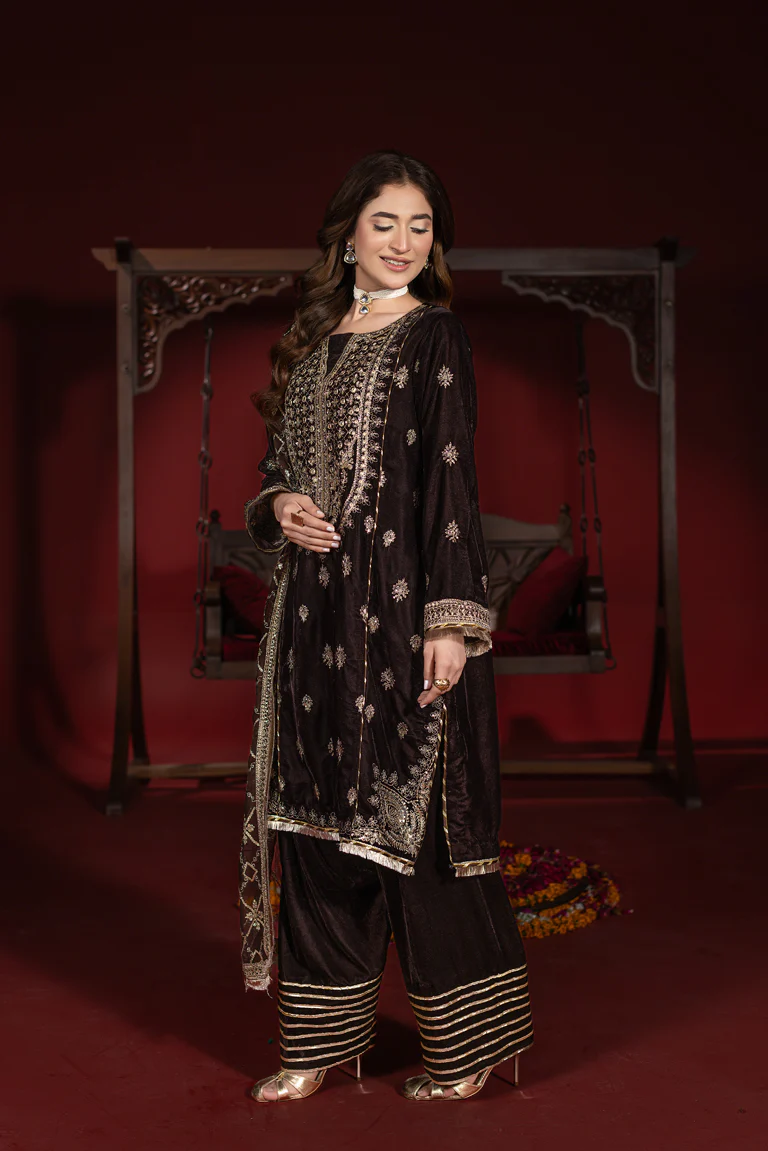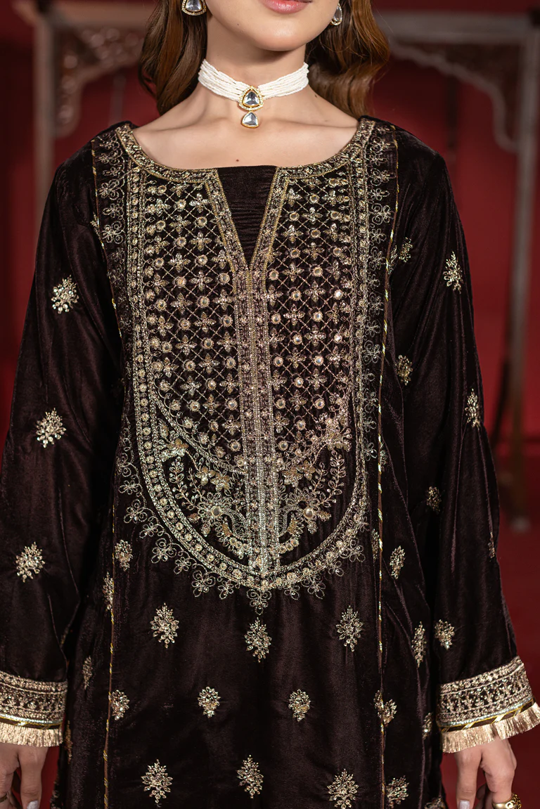 The chocolate brown outfit is made with a rich elegance to indulge in. The small velvet shirt offers the golden thread work on the neckline, front and sleeves. This outfit gives the shirt depth and a festive feel. It is matched with a coordinated Farshi Shalwar having a small golden stripe accent at the hem. The overall look of the attire gives a royal vibe. The embroidered chiffon dupatta has a graceful flow with the border details. This premium velvet outfit gives a soft and luxurious look. This attire is Ideal for Weddings Eid, Formal, dinners and any other event that requires a classic and sophisticated look.