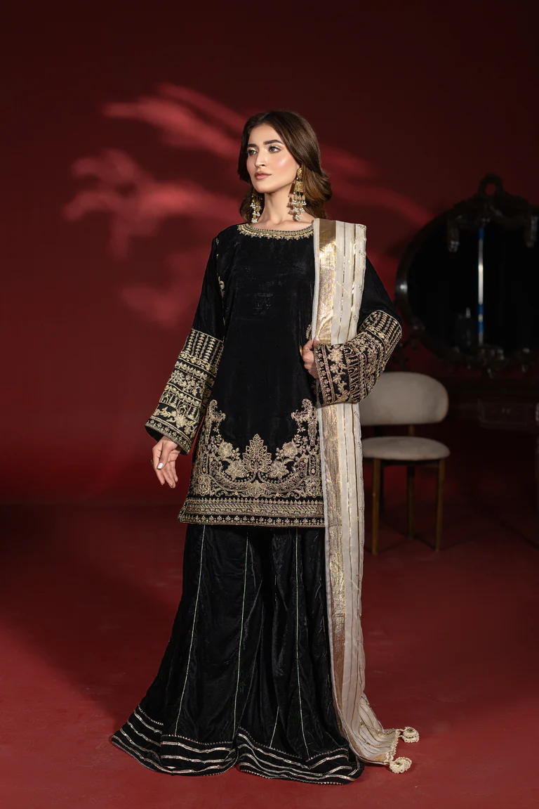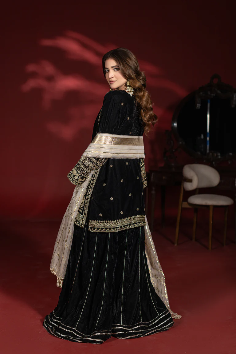 Get the spotlight with this exclusive black velvet outfit. The shirt is heavily embroidered in thread on the front, sleeves, and border of the hemline, giving the rich vibe. Lacy velvet pants with gold stripes on them provide style and shape to the outfit. The outfit is complemented by a contrasting flowing organza dupatta that is light in weight and graceful.
