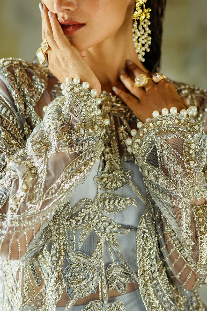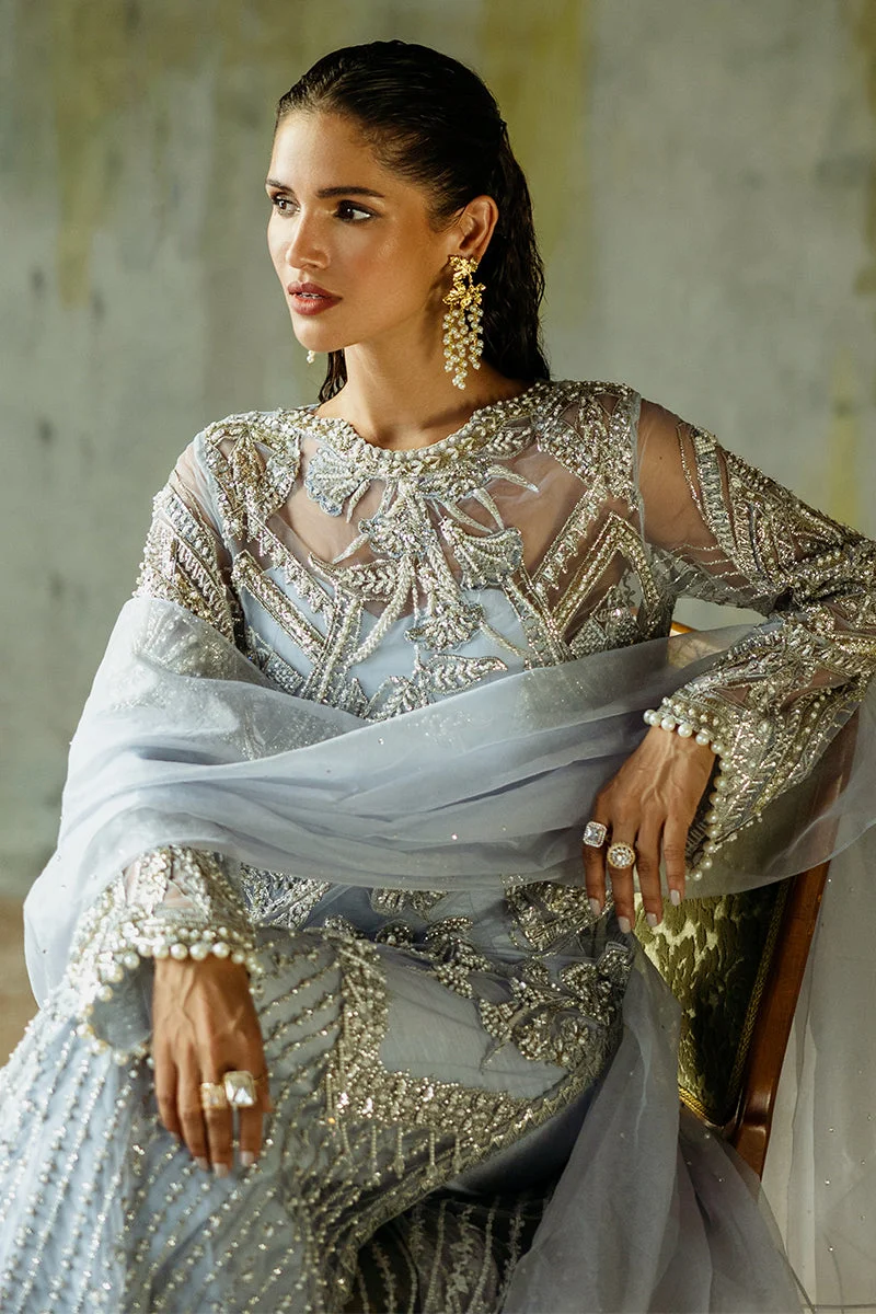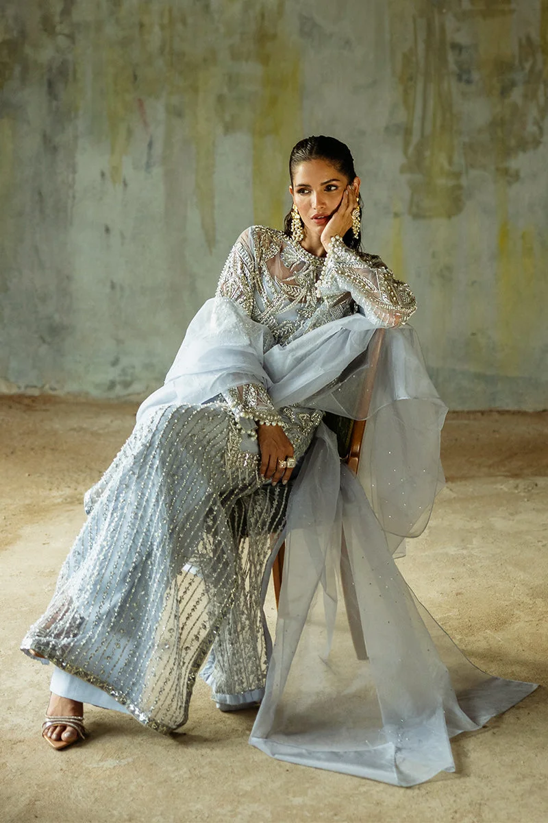 The Pivoine ensemble is a masterclass in refined Pakistani fashion. The centerpiece is a beautifully embroidered net shirt adorned with delicate, intricate embellishments that catch the light with every movement. Paired with tailored raw silk trousers in a complementary ice blue tone, the look achieves a harmonious balance of structure and fluidity. The ensemble is completed by an ethereal organza dupatta, draped to lend an air of timeless grace to the entire silhouette.