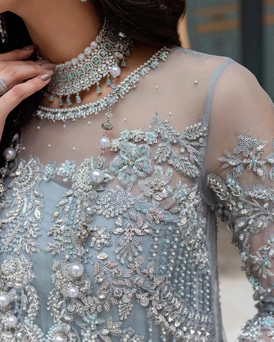 Elevate your festive wardrobe with this stunning ice blue Pure Silk Organza party wear suit by Zilverah — a luxurious 3-piece ensemble featuring intricate embellishments and a pearl-adorned dupatta, crafted for weddings, Walima, and formal celebrations. The ethereal silhouette of a long embellished shirt paired with Raw Silk trousers makes this a showstopping choice for South Asian events. Order now and enjoy free delivery across Norway — bringing authentic Pakistani luxury fashion straight to your door.