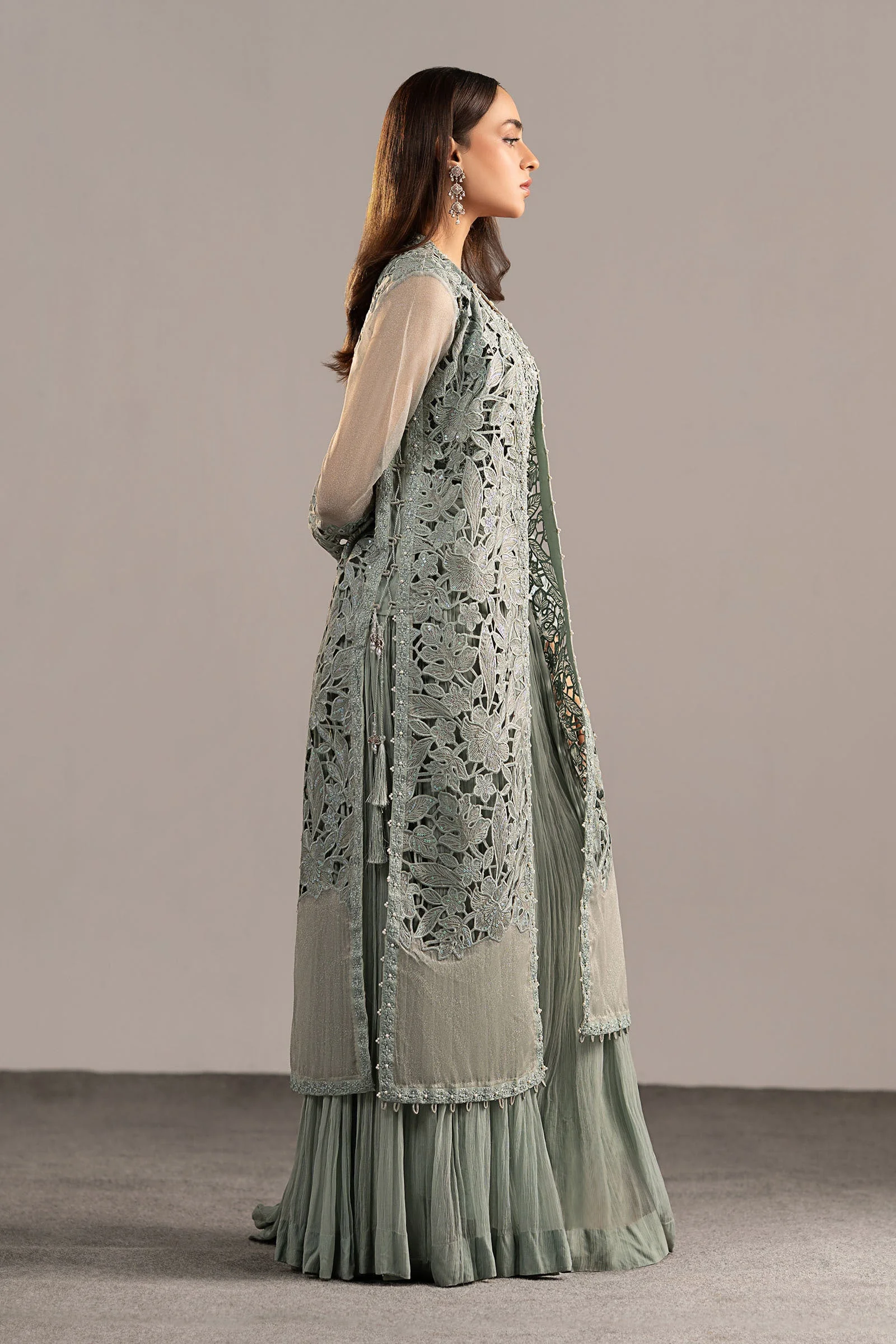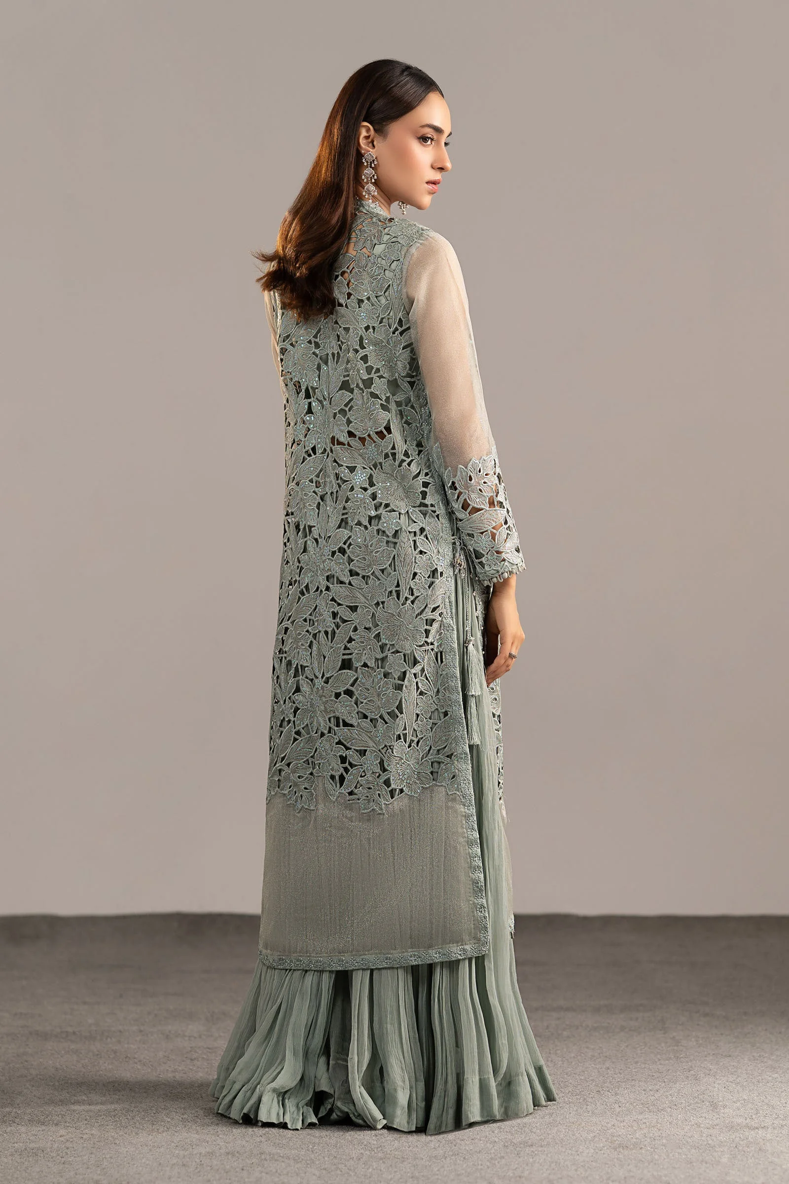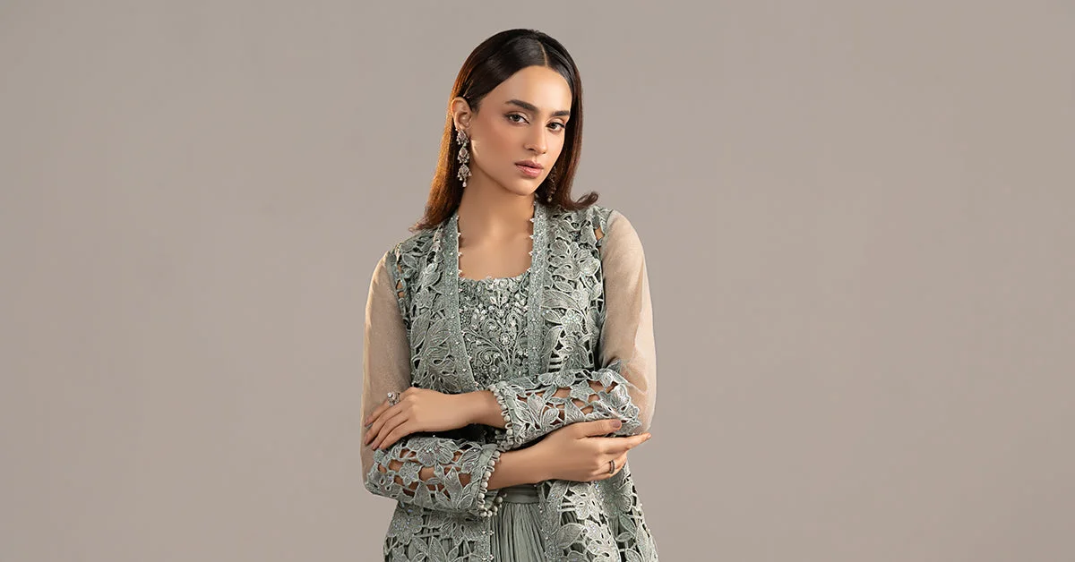 This stunning three-piece suit features a front-open embroidered shirt adorned with intricate Zari embellishments that catch the light beautifully. The accompanying embellished blouse adds a layered dimension of sophistication, while the crushed sharara trouser delivers a fluid, flowing silhouette that is quintessentially South Asian in its grace. The ice blue palette radiates a cool, ethereal elegance that photographs beautifully and turns heads in person.