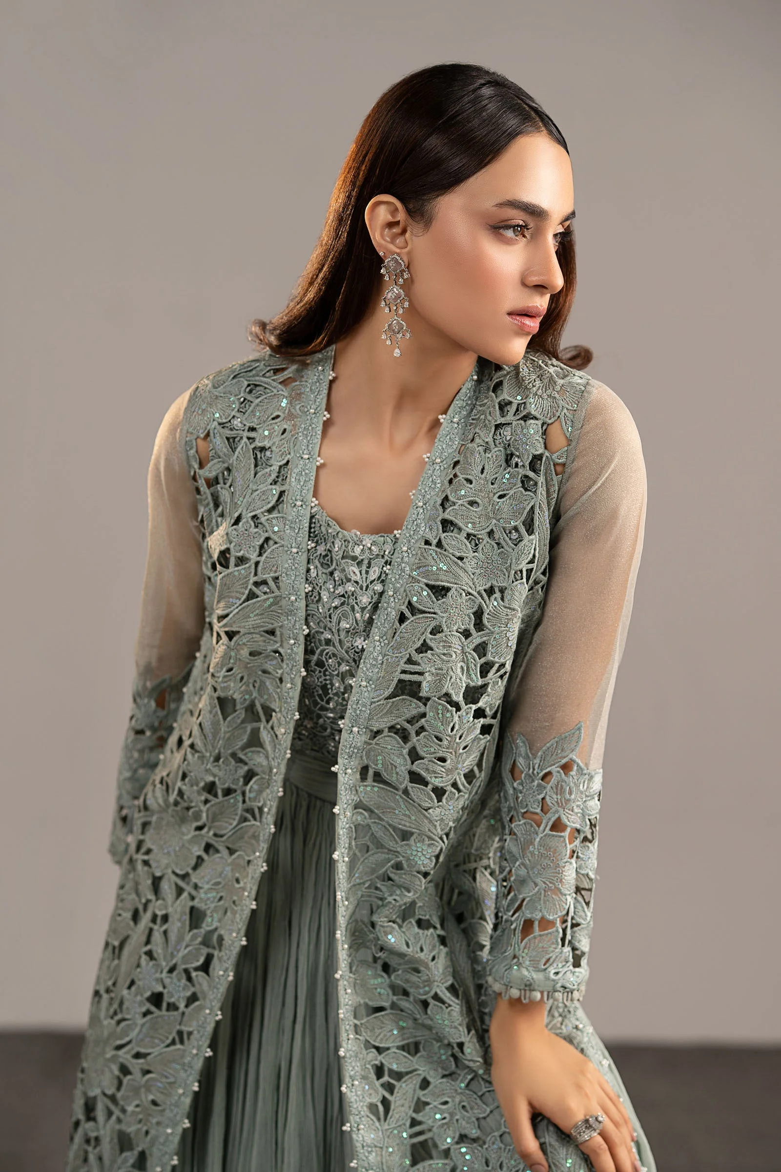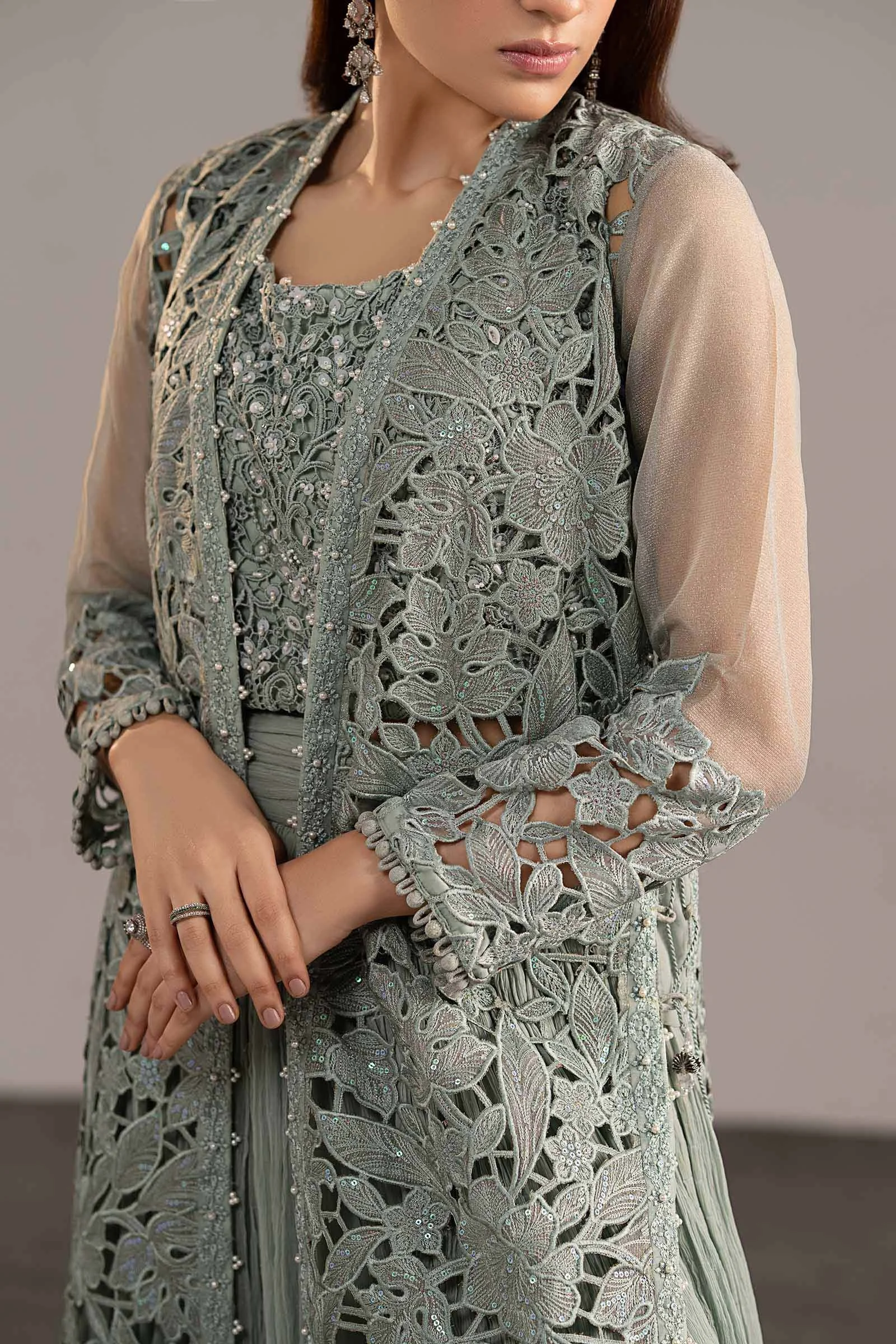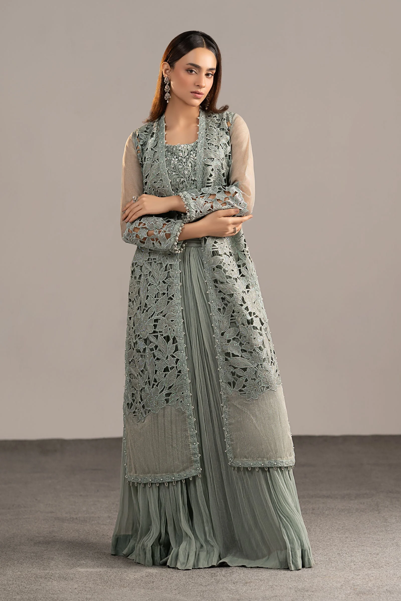 This stunning three-piece suit features a front-open embroidered shirt adorned with intricate Zari embellishments that catch the light beautifully. The accompanying embellished blouse adds a layered dimension of sophistication, while the crushed sharara trouser delivers a fluid, flowing silhouette that is quintessentially South Asian in its grace. The ice blue palette radiates a cool, ethereal elegance that photographs beautifully and turns heads in person.
