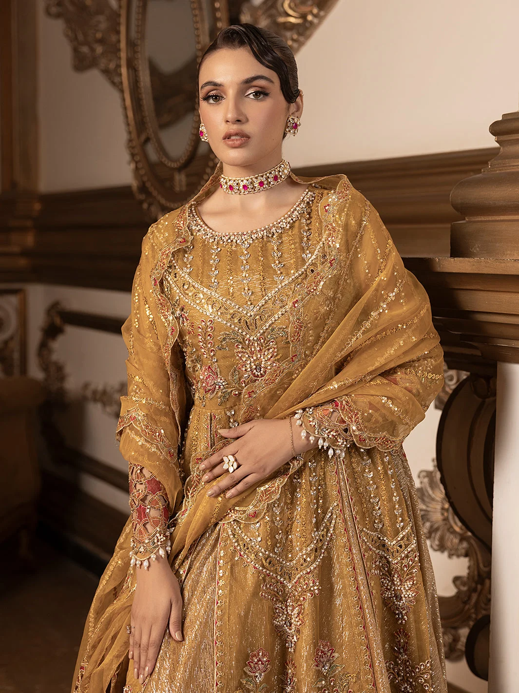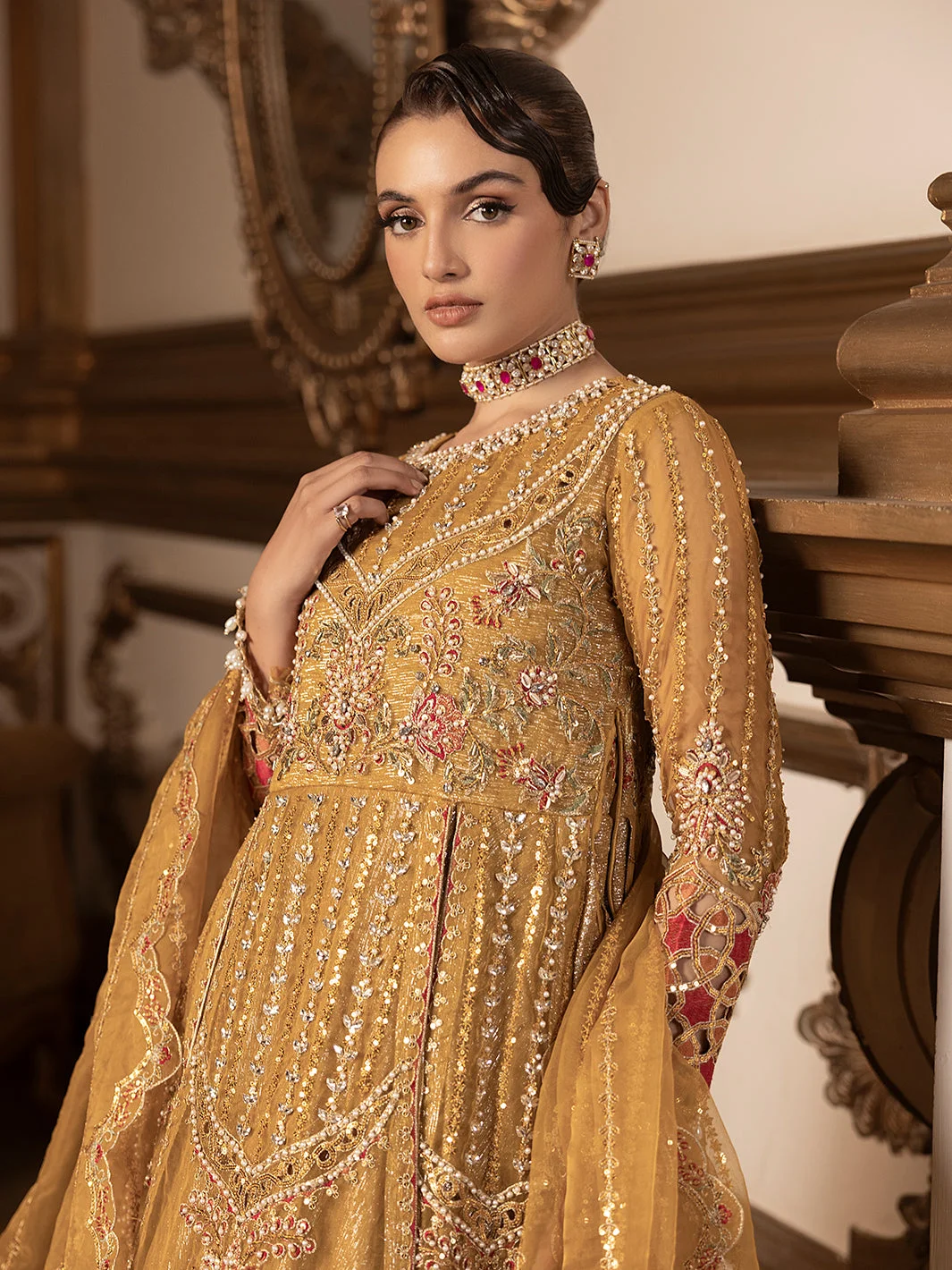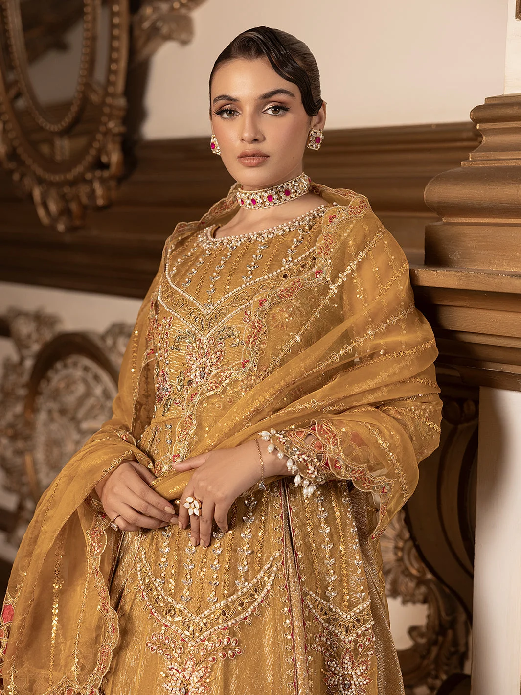 Pair this mustard formal maxi with gold jhumkas and a matching clutch for a fully coordinated festive look. Nude or gold heeled sandals will complement the silhouette effortlessly. Keep makeup warm-toned — think amber eyeshadow and a nude-berry lip — to honour the richness of the mustard palette. Drape the embroidered organza dupatta over one shoulder for a classic South Asian aesthetic.