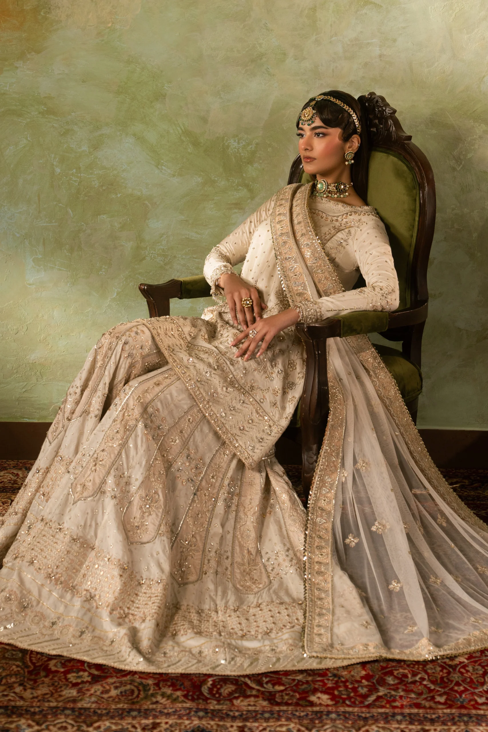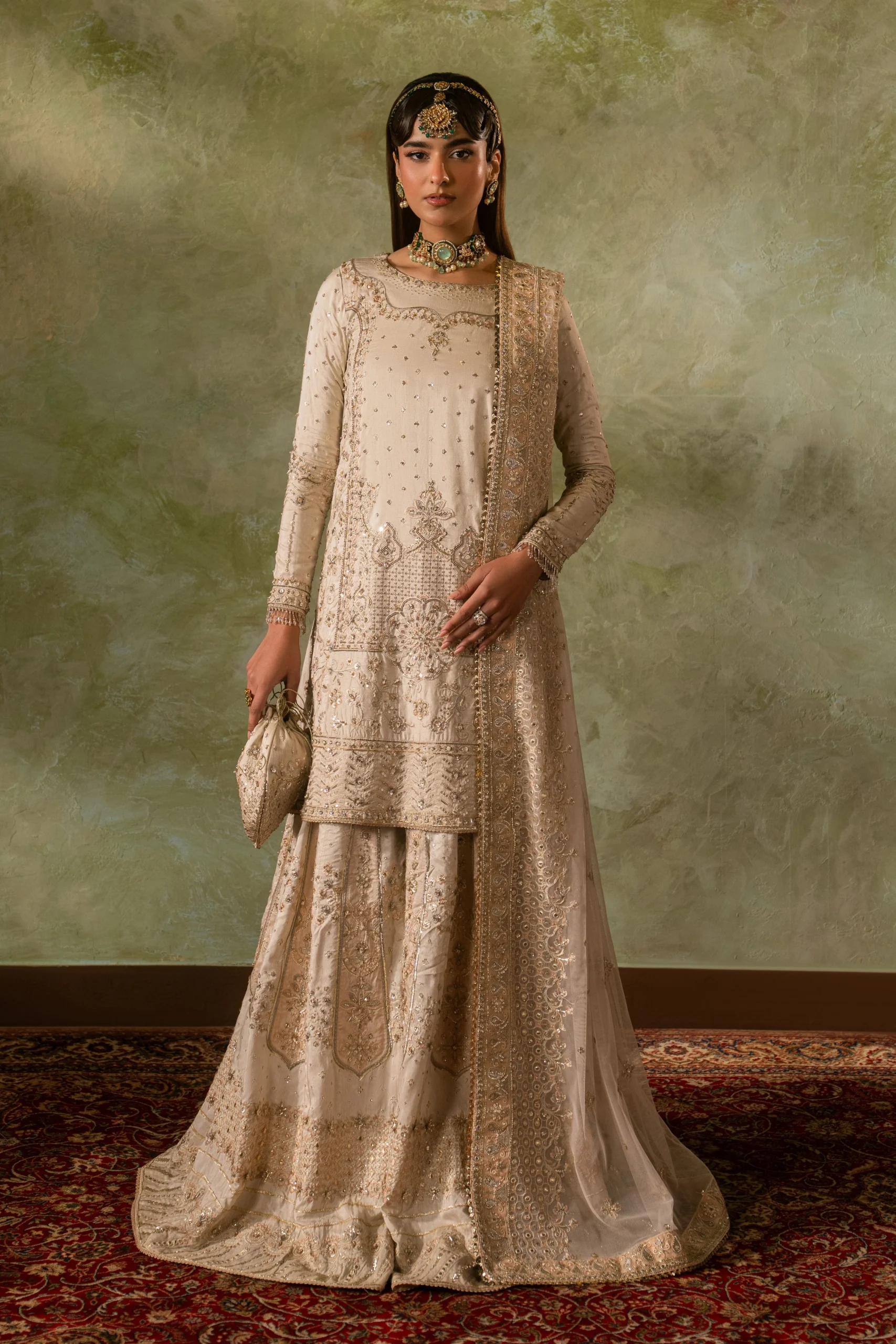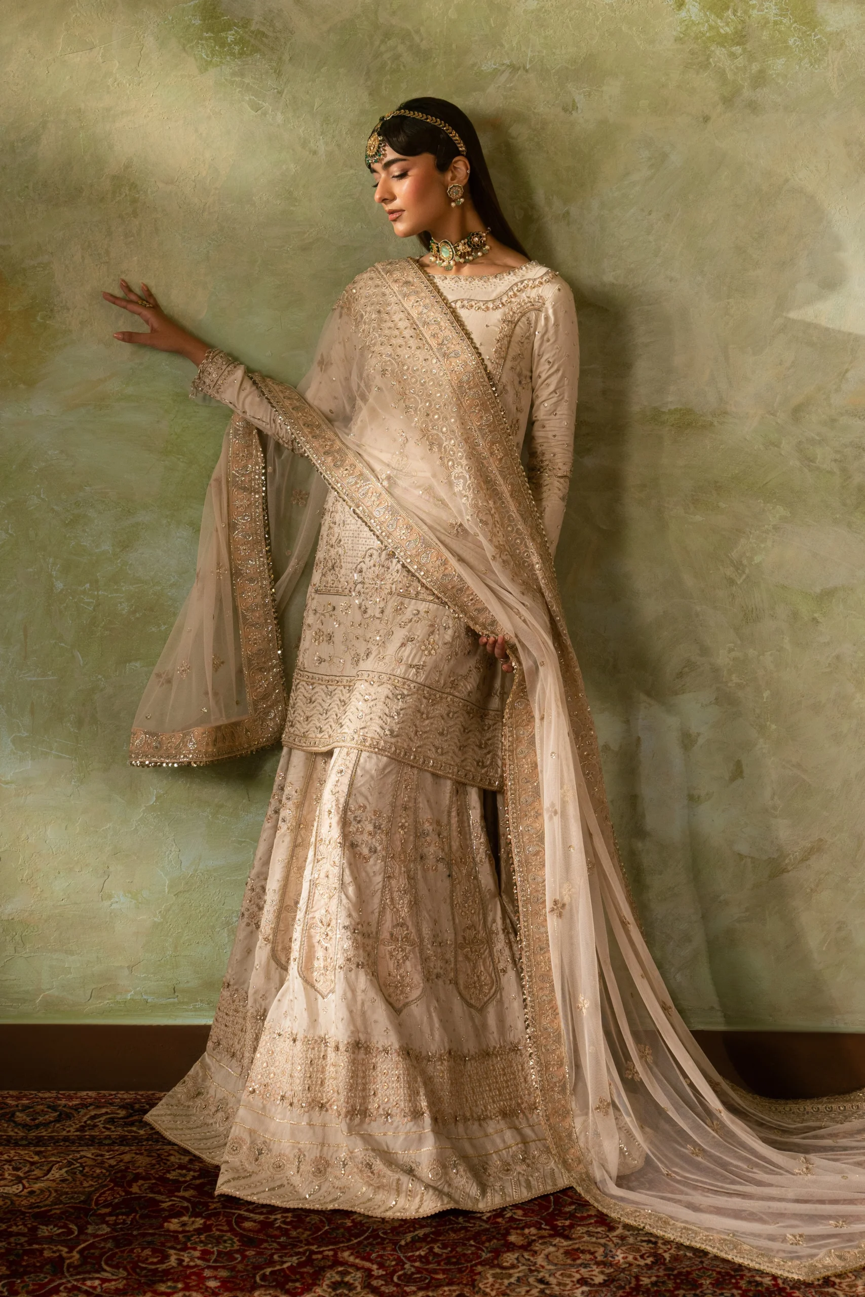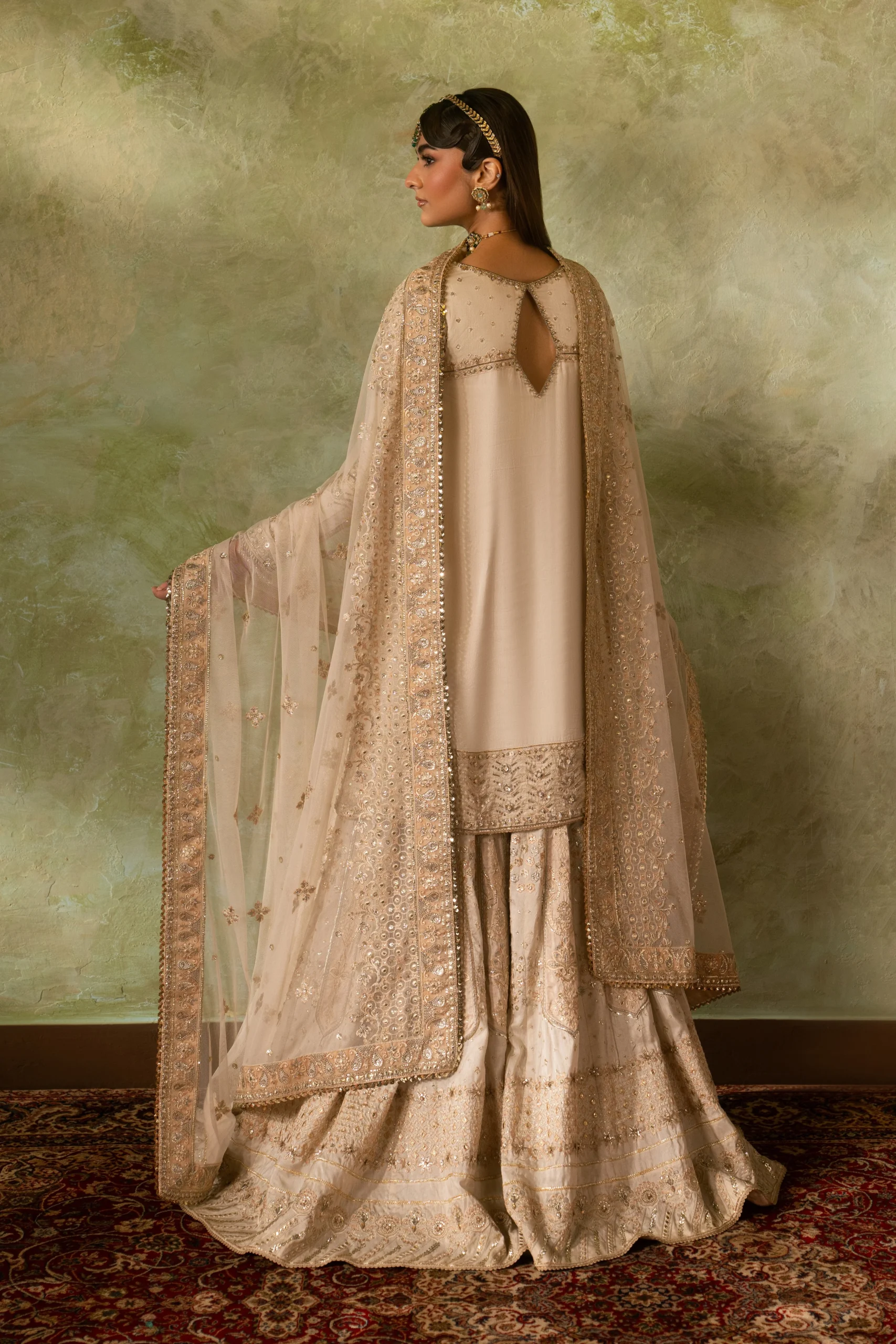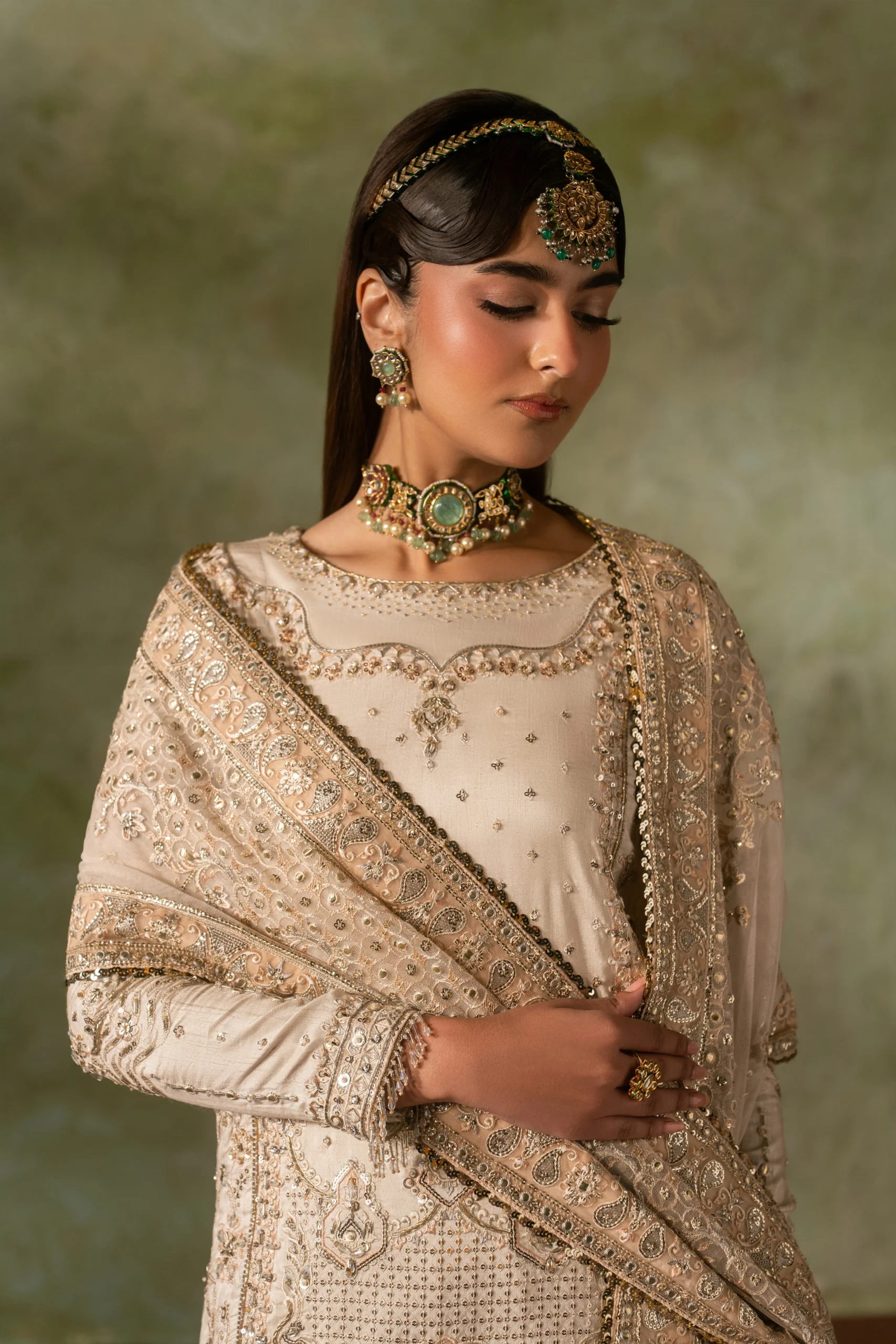 Pair the Damiya with gold Kundan or pearl jewellery for a classic Nikkah look. Soft nude or champagne heels complement the off-white palette beautifully. Style your hair in a loose bun or traditional bridal updo to let the neckline detailing shine.