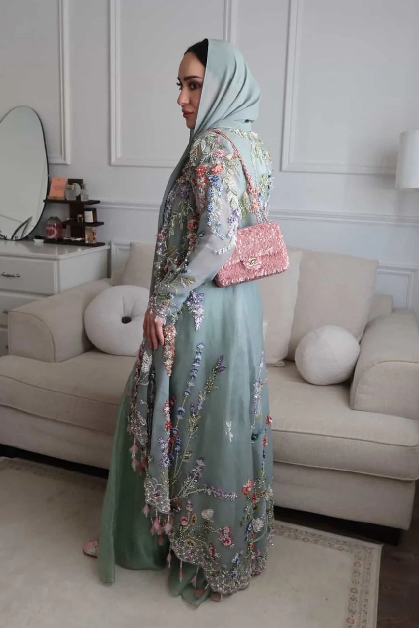 Elevate your formal wardrobe with this stunning 3-piece organza jacket party wear dress by Zilverah — featuring a sleeveless kalidar shift dress, a flowing organza jacket, and a georgette shella in elegant greyish blue and sage green tones. Crafted from pure organza and soft georgette, this ensemble is perfect for weddings, Eid, mehndi, and engagement events. Order now and enjoy free delivery across Norway.