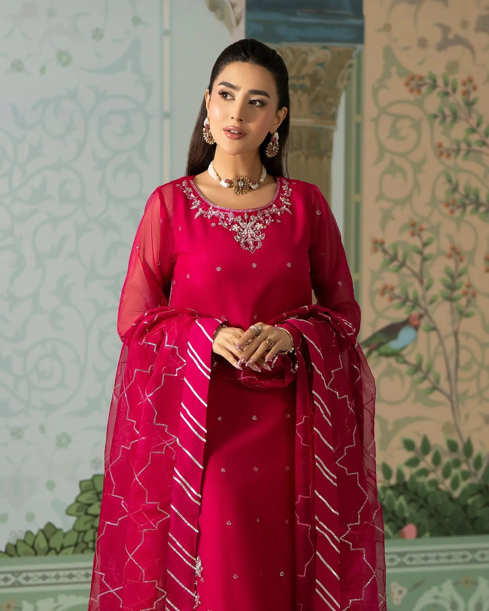 Discover the perfect blend of elegance and tradition with this breathtaking semi pure organza sharara 3-piece set from Zilverah — your go-to destination for authentic Pakistani formal wear in Norway. Whether you’re dressing for a wedding, a festive Eid gathering, or an upscale party, this ensemble is designed to make you unforgettable.