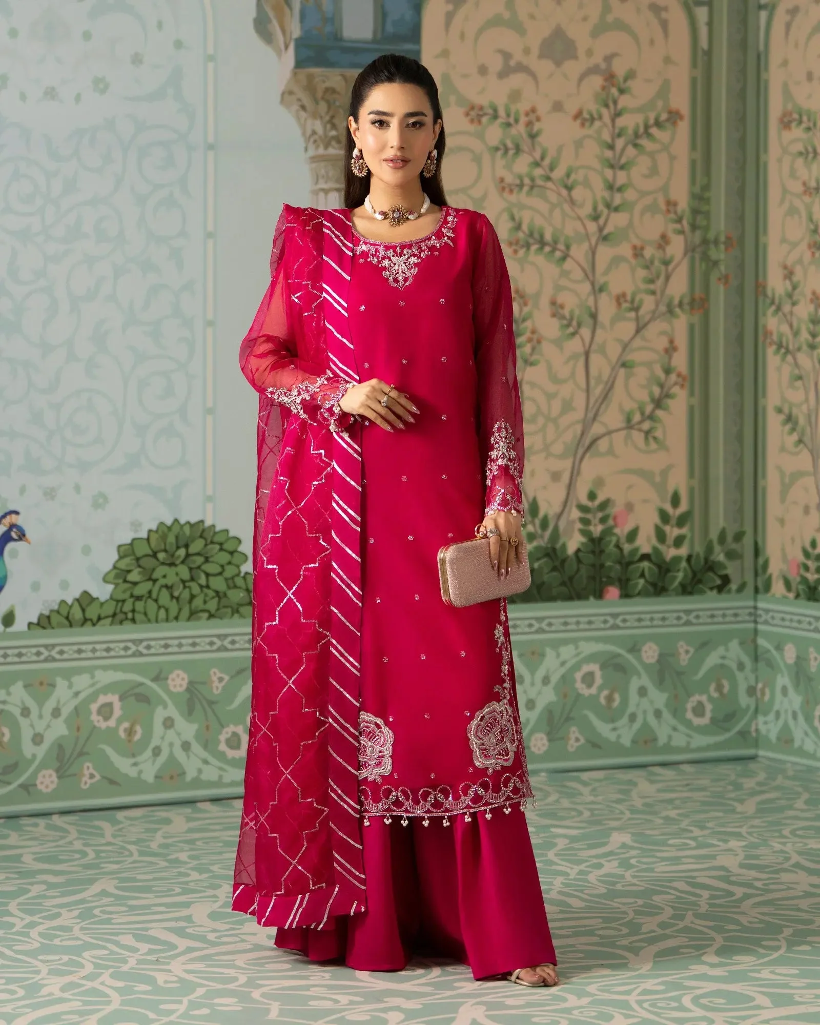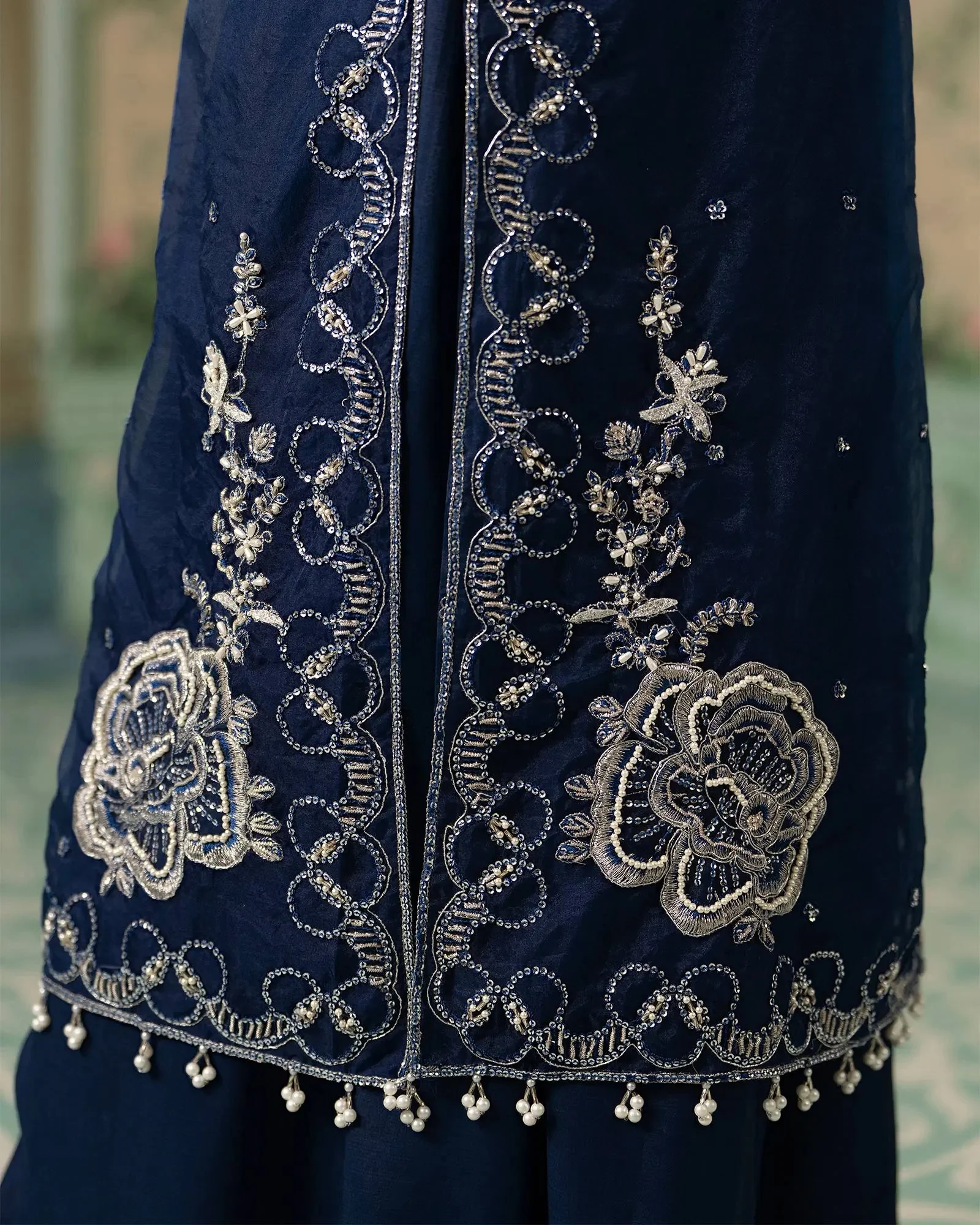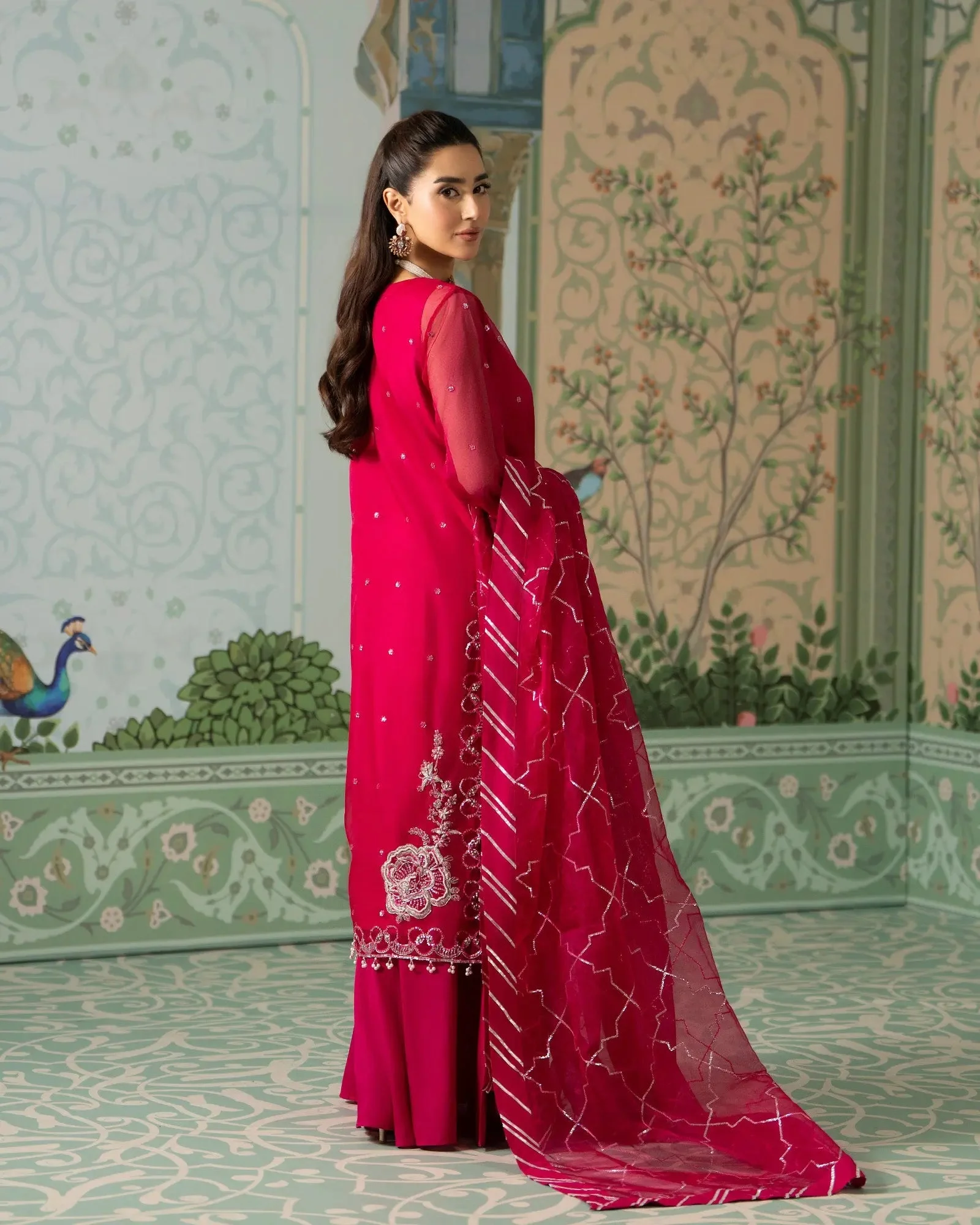 This stunning 3-piece collection showcases the artistry of South Asian craftsmanship at its finest. The shirt is adorned with intricate tilla embroidery, giving it a luxurious, hand-finished appearance that catches the light beautifully. The classic sharara silhouette adds a regal, floor-sweeping drama that is both timeless and on-trend for formal wear occasions.