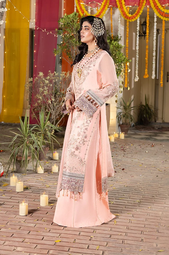 Pair this peach chiffon suit with gold or rose-gold jewellery to complement the warm tones. Nude or champagne heeled sandals work beautifully for a full formal look. Style the dupatta draped over one shoulder for a classic Pakistani formal aesthetic, or pin it elegantly for a contemporary touch. This suit is especially flattering when styled with a light foundation and soft, warm-toned makeup.