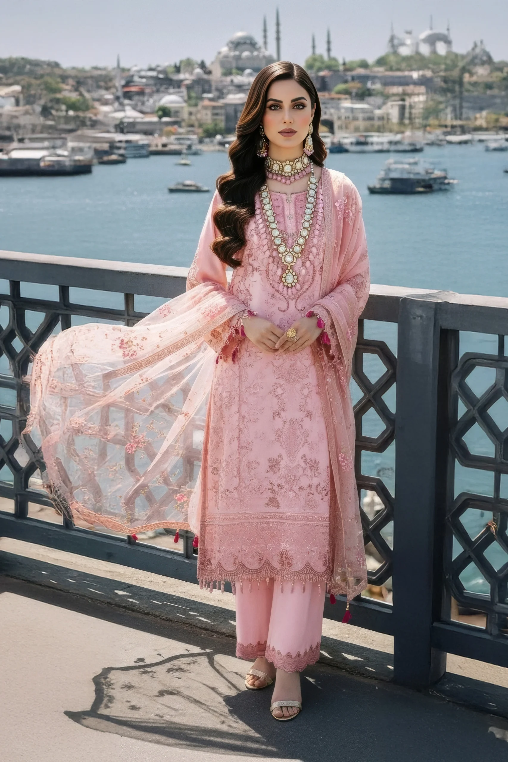 This breathtaking suit features a richly embroidered pure bamber chiffon front adorned with exquisite handmade embellishments that catch the light beautifully. Complementing organza panels add depth and dimension, while the coordinating embroidered dupatta ties the entire look together with graceful sophistication.