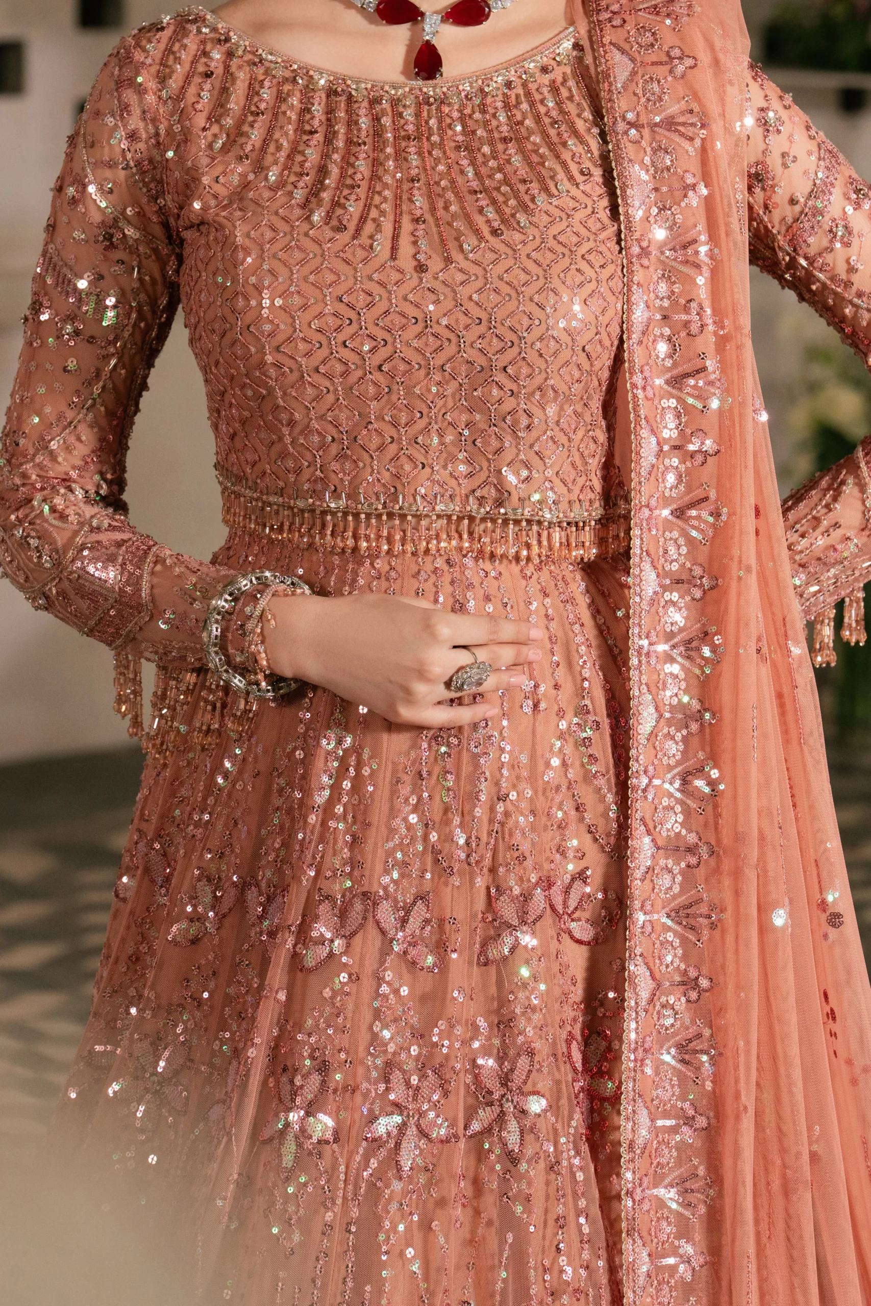 This beautifully crafted ensemble features a fitted embroidered net shirt adorned with delicate threadwork and embellishments that catch the light with every movement. The multi-panel flared lehenga creates a graceful, sweeping silhouette perfect for dancing and socializing, while the soft net dupatta completes the look with an airy, romantic finish. The warm peach tone is universally flattering and ideal for festive occasions.