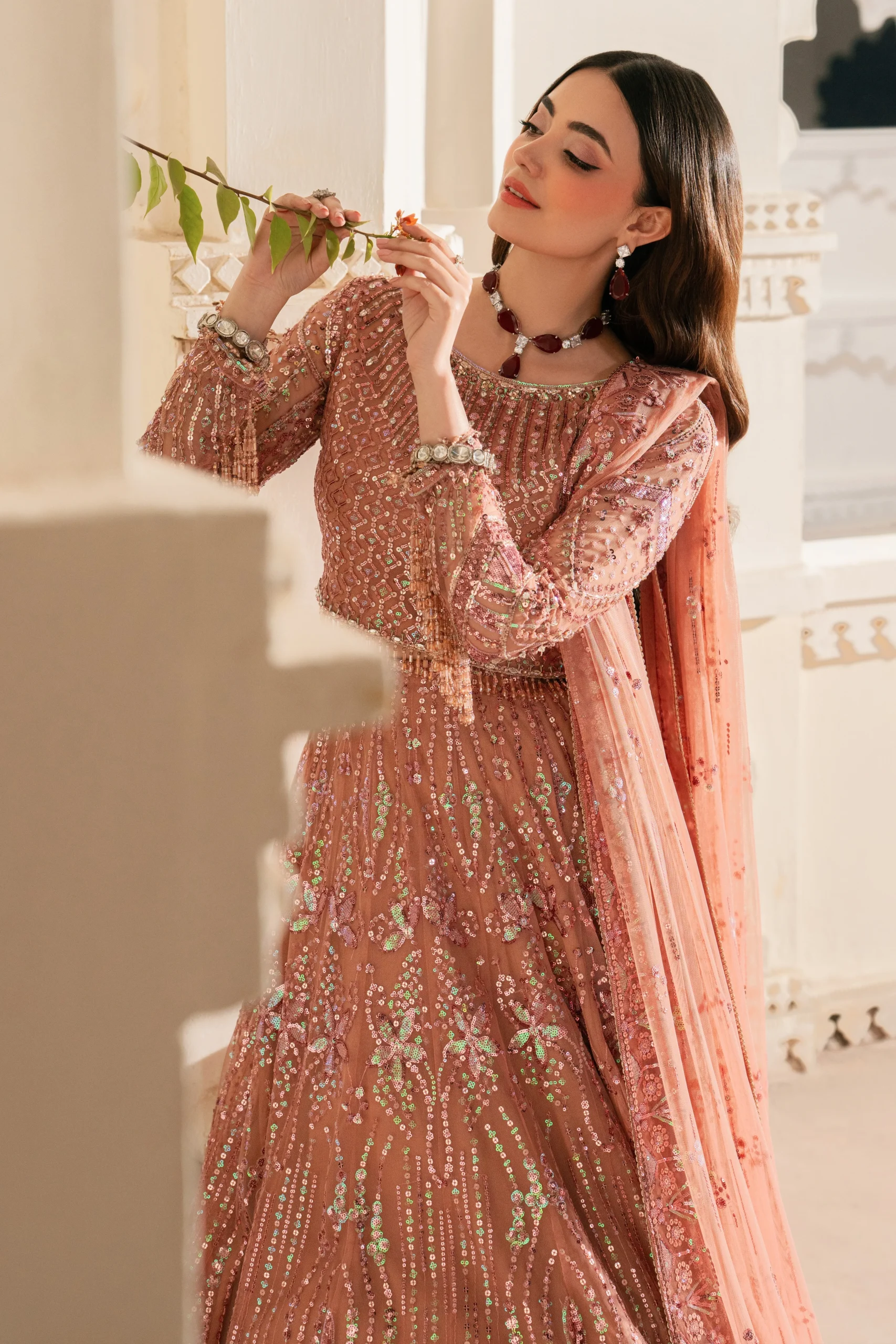 Pair this peach lehenga with gold or rose-gold jewellery to complement its warm tones. Opt for a sleek bun or soft curls to let the dupatta drape beautifully. Nude or gold heels will elongate the look and keep the focus on the stunning embroidery.