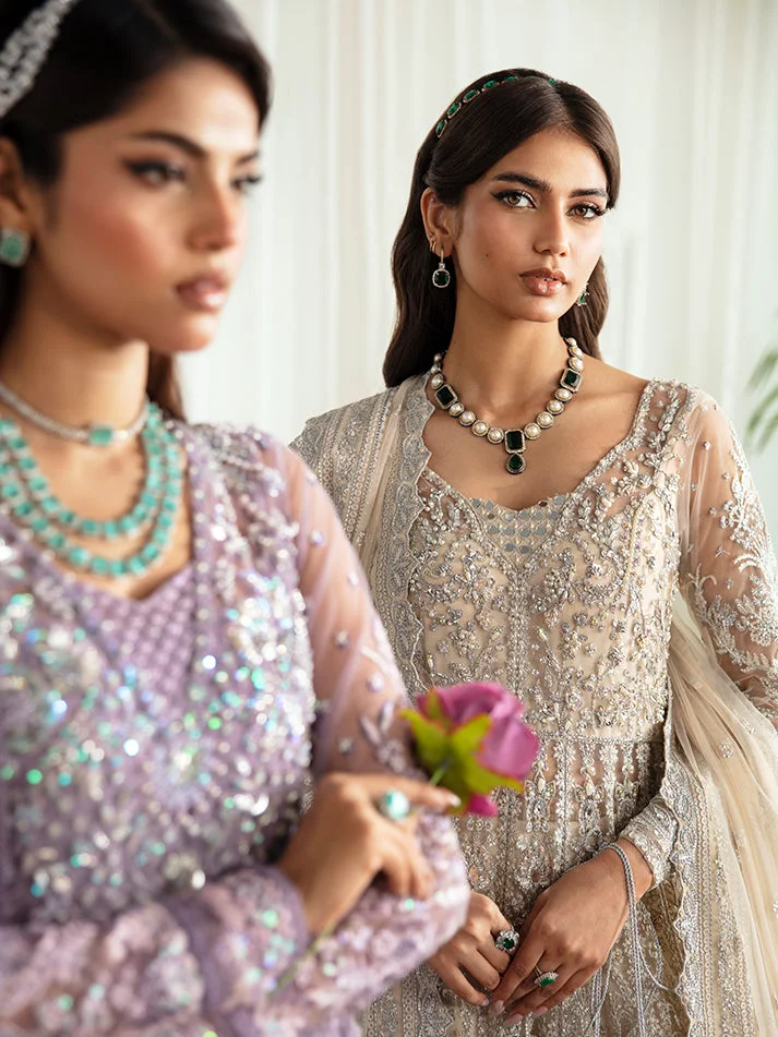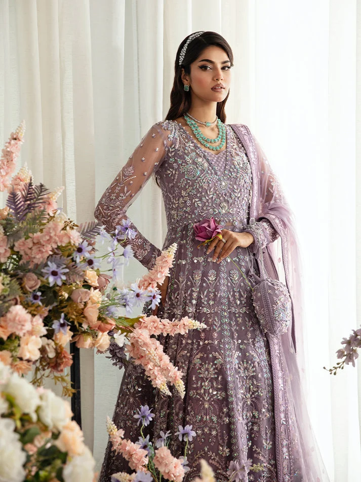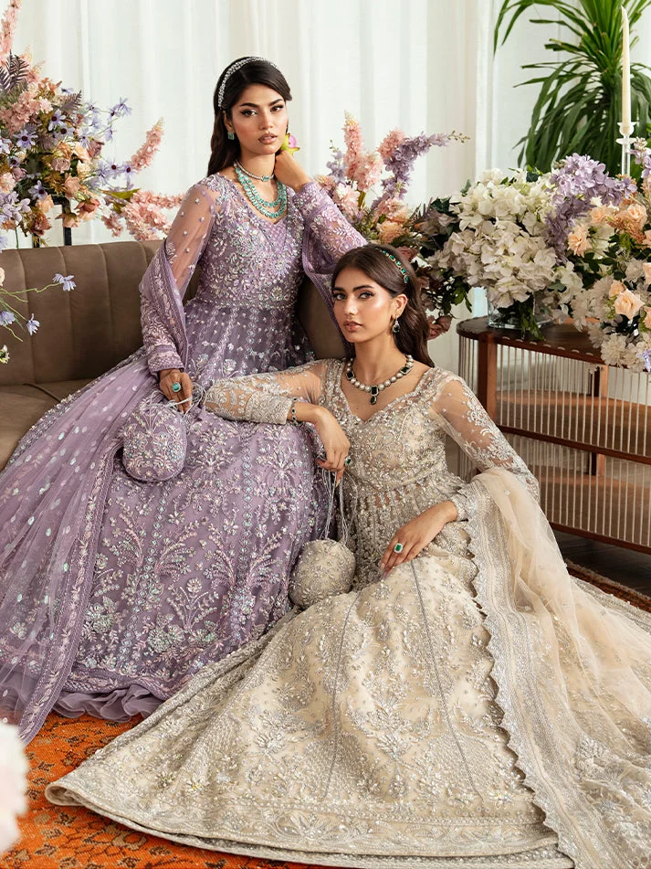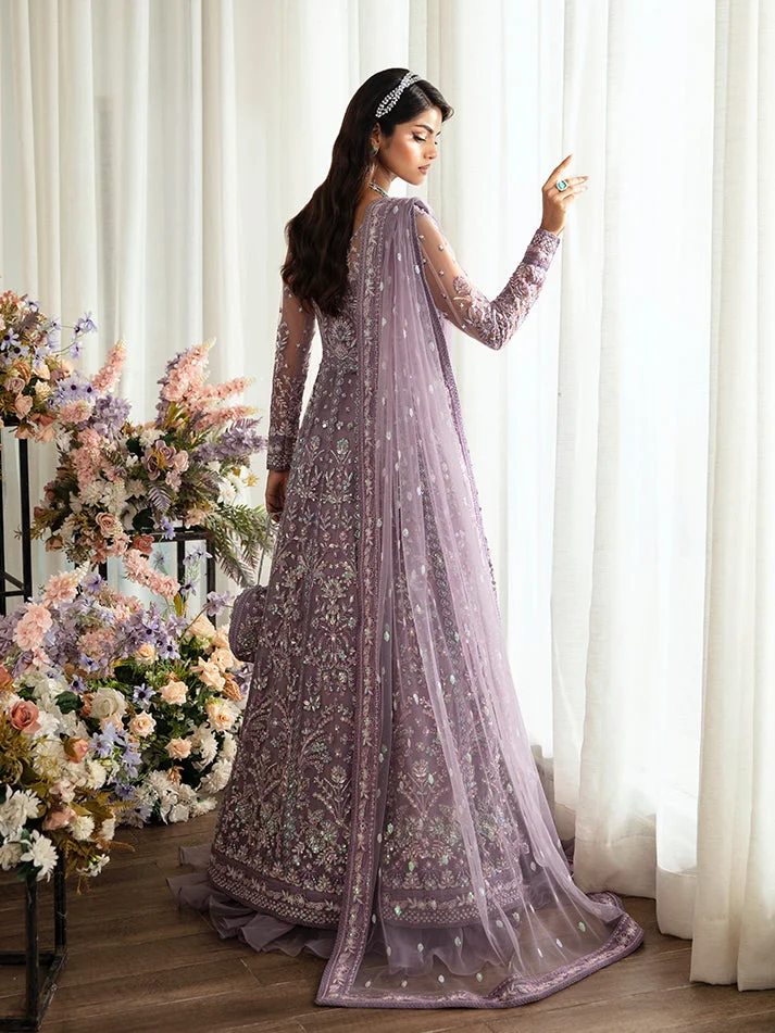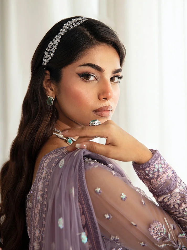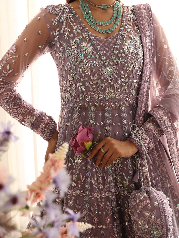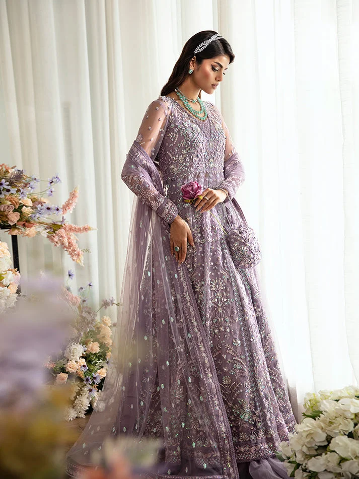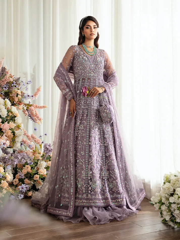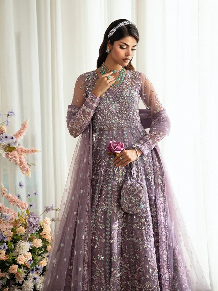 This show-stopping piece is a celebration of traditional Pakistani craftsmanship reimagined for contemporary luxury. The flared kalidaar silhouette creates an effortlessly regal look, while the deep, rich purple tone adds a sense of opulence and drama perfect for formal occasions.