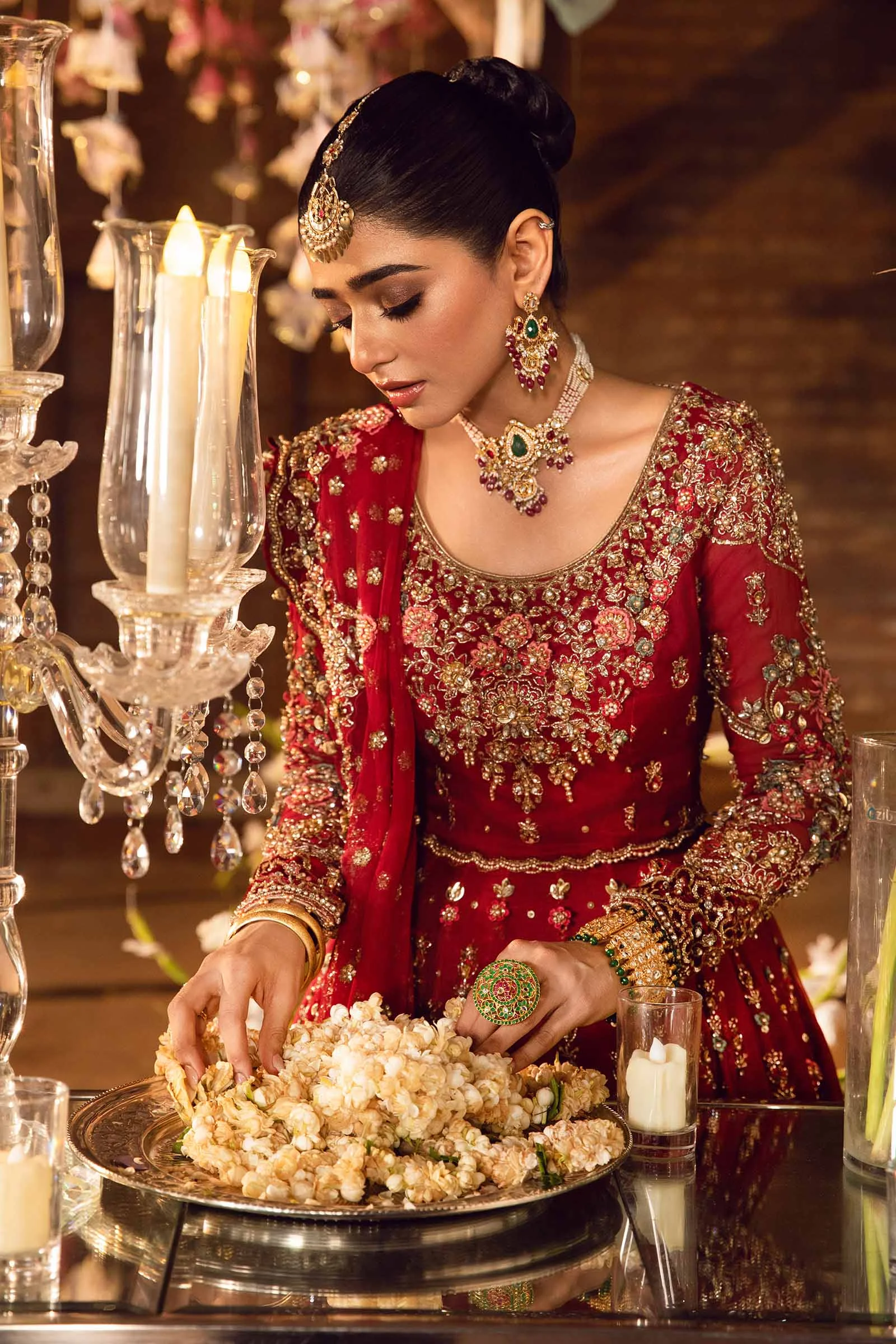 Every inch of this creation tells a story of meticulous craftsmanship. The enchanting red palette forms the perfect canvas for layers of exquisite detailing that make this dress truly extraordinary.