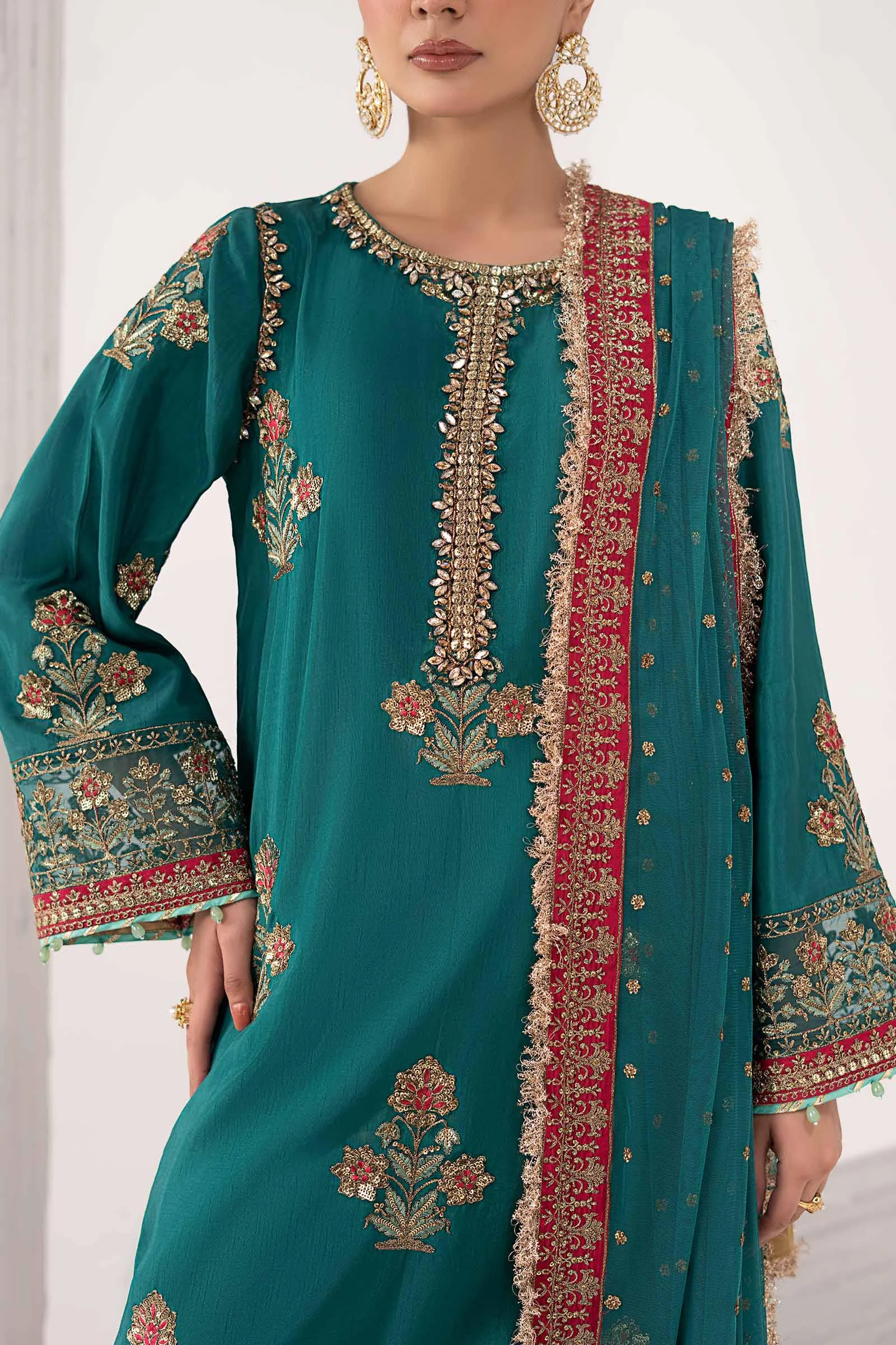 Elevate your evening presence with the Zilverah Teal Raw Silk 3-Piece Suit — a breathtaking ensemble featuring intricate hand-embellished embroidery, pearl drop detailing, and a shimmering net dupatta adorned with Kiran lace. Crafted in luxurious raw silk, this exquisite formal wear piece is perfect for Eid celebrations, weddings, and upscale gatherings. Order now and enjoy free delivery across Norway — bringing authentic South Asian fashion straight to your door in Scandinavia.