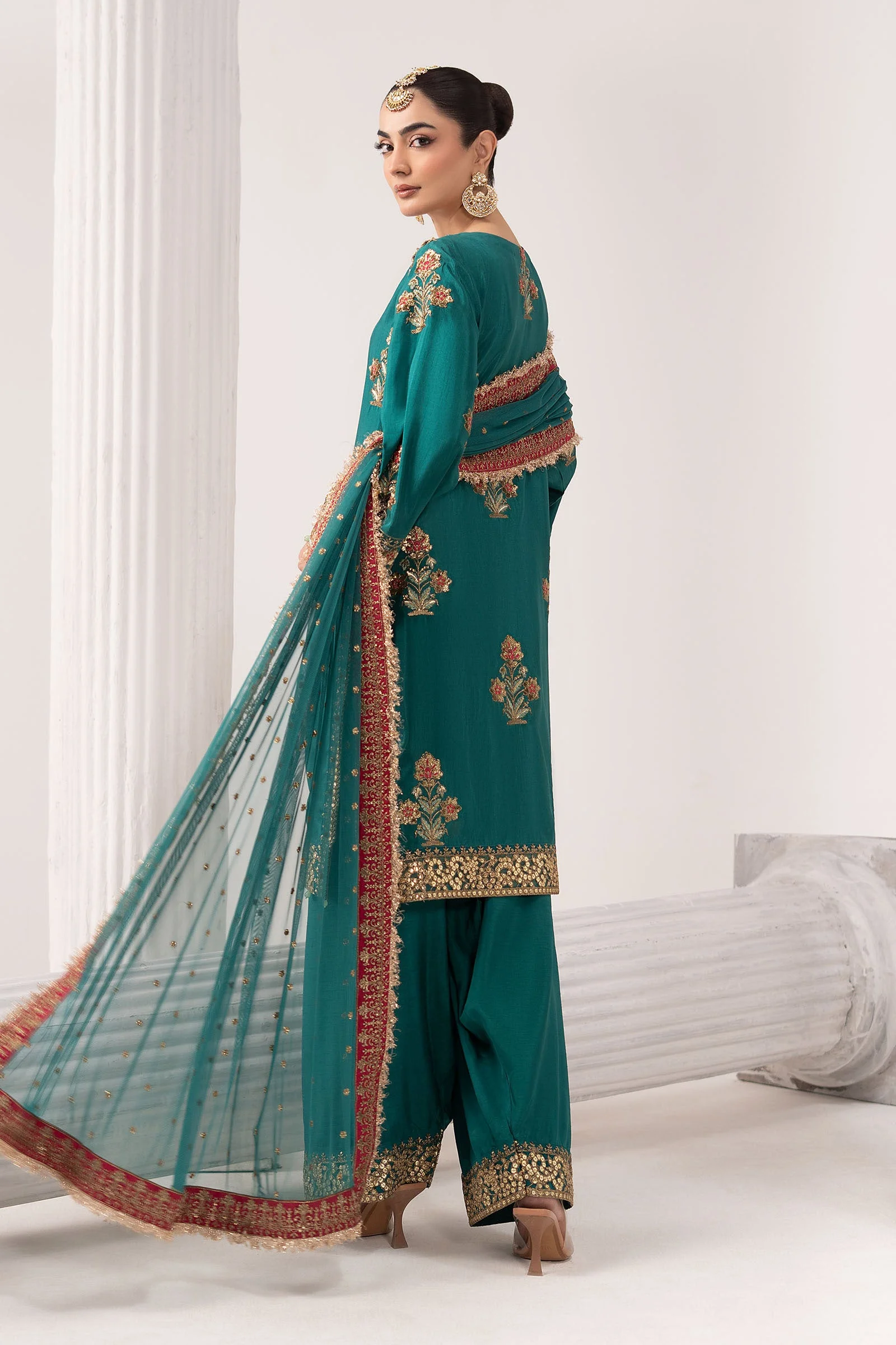 Pair this teal ensemble with gold jhumkas and strappy heeled sandals for a classic bridal-event look. Keep your makeup warm and luminous to complement the rich teal tone. A sleek bun or soft waves work beautifully with the embellished dupatta draped over one shoulder. This piece of South Asian fashion in Scandinavia transitions effortlessly from afternoon Eid dawats to grand evening functions.