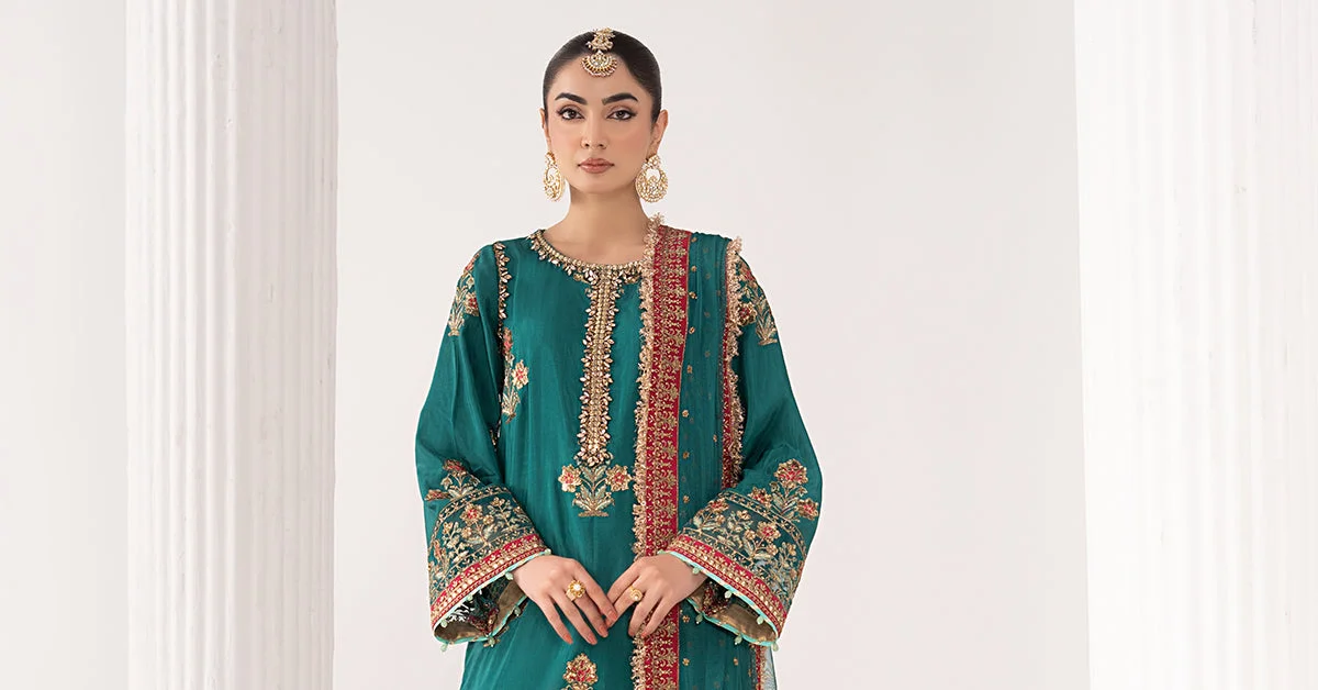 Discover the elegance of Zilverah’s Teal Raw Silk Embroidered 3-Piece Suit — a stunning statement in formal wear designed for the modern South Asian woman living in Norway. Whether you’re dressing for Eid, a wedding reception, or an exclusive evening event, this beautifully crafted ensemble delivers the perfect blend of traditional artistry and contemporary sophistication. Now available to buy online in Norway, delivered swiftly and safely to your home in Oslo, Bergen, Stavanger, or anywhere across Scandinavia.