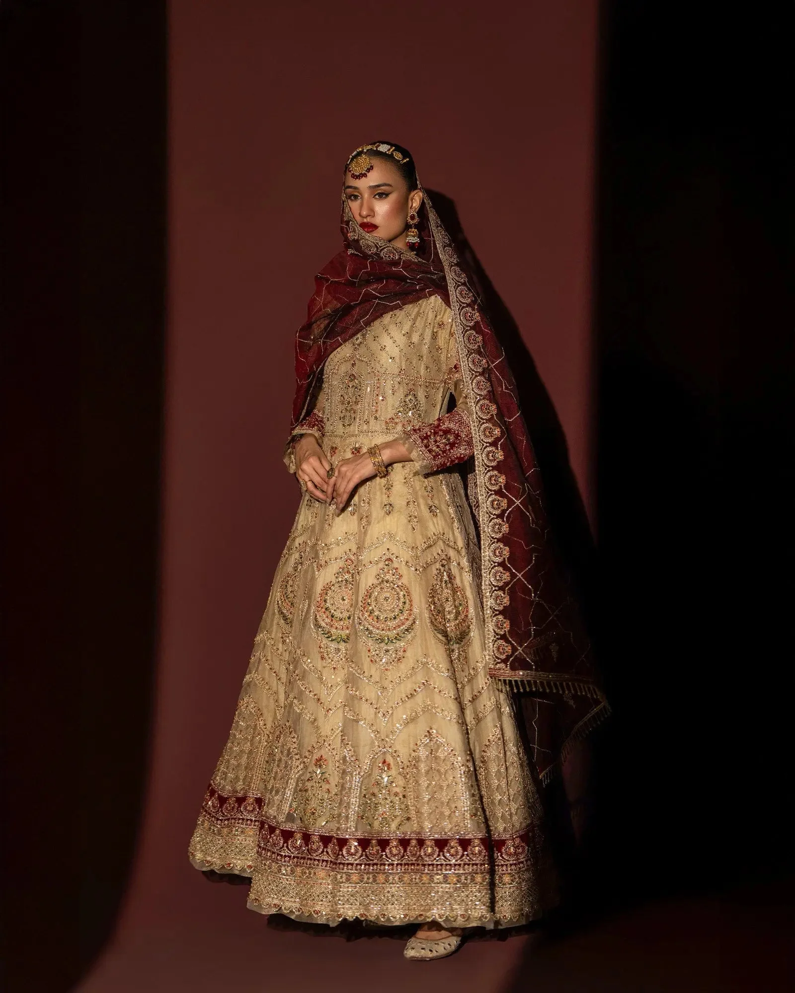 Pair this nude tissue maxi with gold or rose gold jewellery to enhance the warm skin tone of the fabric. Nude or champagne heels will elongate the silhouette beautifully. For mehndi events, consider adding colourful bangles for a pop of vibrancy. The organza net dupatta can be styled over the shoulder or draped classically for a more traditional look.